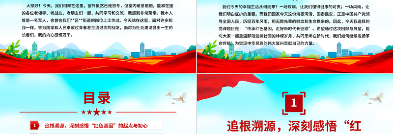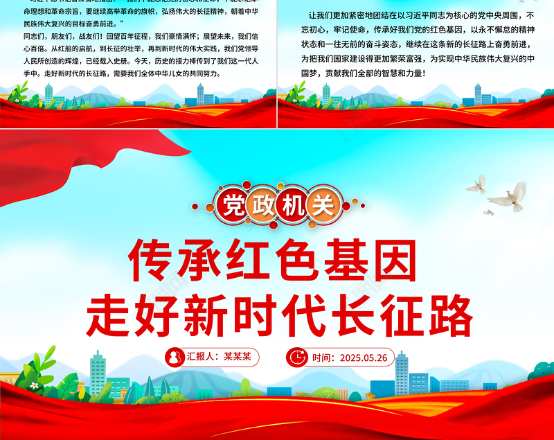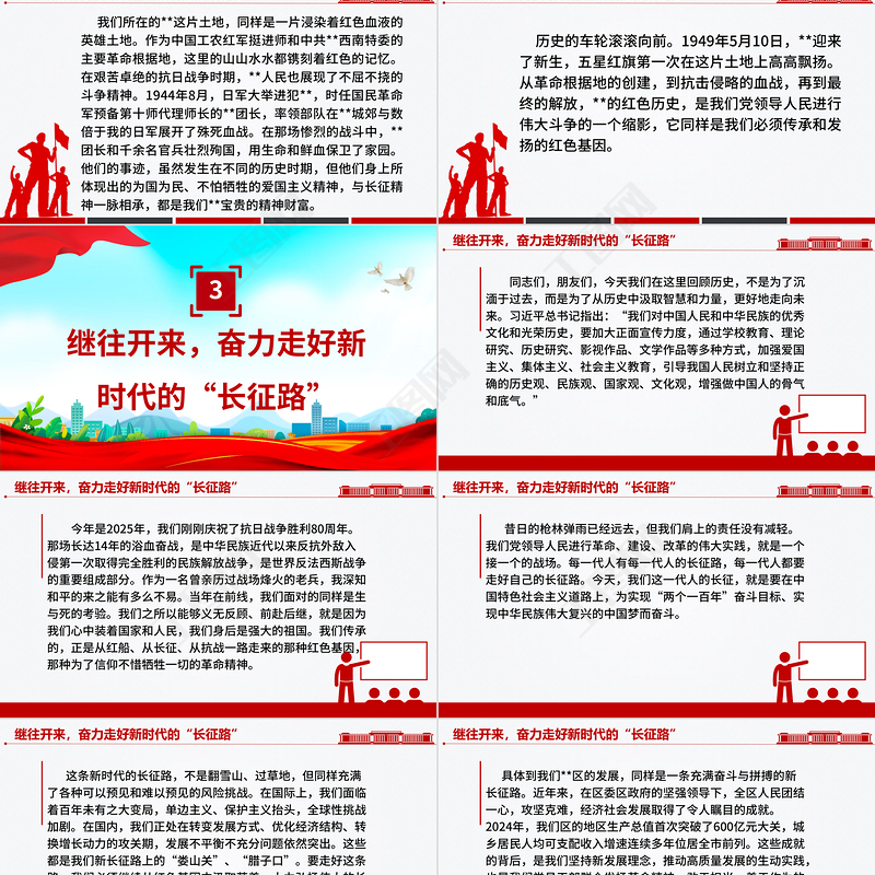 傳承紅色基因 走好新時代長征路 黨政機關 匯報人:某某某 時間:2025.05.26 大家好!今天,我們相聚在這里,窗外雖然已是初冬,但室內暖意融融。能和在座 的各位老領導、老戰友、老朋友們一起,共同學習和交流,我感到非常榮幸。我本人 曾是一名軍人,也曾在我們**區**街道的崗位上工作過。今天站在這里,面對許多和 我一樣,曾為國家和人民奉獻過青春甚至流過血的戰友,面對為社會建設付出一生的 長者們,我的內心感慨萬千。 前 言 我們今天的幸福生活從何而來?一場疾病,讓我們懂得健康的可貴;一場風雨,讓 我們明白庇護的重要。而我們國家今天這份海晏河清、國泰民安,正是中國共產黨領 導全國人民,歷經百年風雨,用無數先輩的鮮血和生命換來的。因此,今天我選擇的 黨課題目是:“傳承紅色基因,走好新時代長征路”。希望通過這次回顧與展望,能 與大家一起重溫那段波瀾壯闊的崢嶸歲月,共同思考在新時代,我們如何繼續發揚革 命傳統,為實現中華民族的偉大復興貢獻自己的力量。 前 言 目錄 1 追根溯源,深刻感悟“紅色基因”的起點與初心 2 淬火成鋼,深刻領會長征精神的磅礴偉力 3 繼往開來,奮力走好新時代的“長征路” 1 追根溯源,深刻感悟“紅 色基因”的起點與初心 追根溯源,深刻感悟“紅色基因”的起點與初心 每一條大江,都有它的源頭;每一個偉大的事業,都有它夢想開始的地方。我們黨的紅色基因,其源頭, 就在那風雨如磐的年代,在那一葉小小的紅船之上。 1921年的夏天,在**的石庫門,一群平均年齡只有28歲的知識分子,懷著救國救民的理想,秘密召開了 中國共產黨的第一次全國代表大會。在那個黑暗的年代,軍閥混戰,列強環伺,國家四分五裂,人民在 水深火熱中掙扎。無數仁人志士探索救亡圖存的道路,但都以失敗告終。正是在這樣的歷史背景下,馬 克思主義的曙光照進了中國,中國共產黨的誕生,就如同在漫漫長夜中點燃的一支火炬,給苦難深重的 中華民族帶來了希望。 會議因受到巡捕襲擾,最后轉移到了**的**湖上的一艘游船中繼續。就是在這艘小小的紅船上,中國共 產黨宣告正式成立。一葉紅船,見證了開天辟地的大事變,成為了中國革命源頭的象征。它所承載的, 是“開天辟地、敢為人先”的首創精神,是“堅定理想、百折不撓”的奮斗精神,是“立黨為公、忠誠 為民”的奉獻精神。這“紅船精神”,正是我們黨紅色基因最初的、最核心的密碼。 追根溯源,深刻感悟“紅色基因”的起點與初心 很多人可能不知道,我們現在每年慶祝的“七一”建黨紀念日,它的確定本身就是一段歷史的 見證。1938年,在延安,毛澤東同志在《論持久戰》的演講中首次提出,將7月1日作為黨的 誕生紀念日。在那個抗日烽火連天的艱苦歲月里,確定這樣一個日子,就是要提醒全體黨員, 無論環境多么惡劣,斗爭多么殘酷,都不要忘記我們從哪里來,為什么出發。 “其作始也簡,其將畢也必巨。”從**石庫門到**,從**湖的紅船到天安門城樓的莊嚴宣告, 我們黨從最初的50多名黨員,發展到今天擁有超過九千八百萬名黨員的世界第一大執政黨。這 期間,經歷了無數的艱難險阻和生死考驗。支撐我們黨一路走來的,正是那份為中國人民謀幸 福、為中華民族謀復興的初心和使命。習近平總書記反復強調,要“不忘初心、牢記使命”。 這份初心,就是我們紅色基因的內核,是我們戰勝一切困難和風險的力量源泉。 2 淬火成鋼,深刻領會長征 精神的磅礴偉力 淬火成鋼,深刻領會長征精神的磅礴偉力 如果說“紅船精神”是我們黨夢想起航的燈塔,那么長征精神,就 是我們黨在血與火的考驗中淬煉成鋼,用生命和意志鑄就的一座不朽 豐碑。 “紅軍不怕遠征難,萬水千山只等閑。”每當讀起這句詩,那幅氣 壯山河的歷史畫卷就在我們眼前展開。1934年10月,由于第五次反 “圍剿”的失敗,中央紅軍被迫從**等地開始戰略轉移,踏上了漫漫 長征路。在長達兩年的時間里,紅軍將士們跨越了近20個省份,翻越 了連綿的雪山,走過了茫茫的草地,突破了上百萬敵軍的圍追堵截。 從血戰湘江的慘烈,到遵義會議的轉折;從四渡赤水的用兵如神,到 巧渡金沙江的天險變通途;從強渡大渡河、飛奪瀘定橋的英勇,到爬 雪山、過草地的堅韌。兩萬五千里長征,是人類歷史上一次無與倫比 的遠征,是一部感天動地的英雄史詩。 淬火成鋼,深刻領會長征精神的磅礴偉力 長征的勝利,靠的不是船堅炮利,而是紅軍將士們心中 那份堅如磐石的共產主義理想和革命信念。正是這份信念, 讓他們在饑寒交迫、傷病纏身、強敵環伺的絕境中,依然 保持著高昂的革命樂觀主義精神。長征途中,犧牲的營以 上干部多達430余人,平均年齡不到30歲。他們用年輕的 生命,為革命的勝利鋪就了道路。長征的勝利,充分證明 了中國共產黨人無與倫比的領導智慧和頑強意志,鑄就了 偉大的長征精神。 淬火成鋼,深刻領會長征精神的磅礴偉力 習近平總書記深刻指出,長征精神,就是把全國人民和 中華民族的根本利益看得高于一切,堅定革命的理想和信 念,堅信正義事業必然勝利的精神;就是為了救國救民, 不怕任何艱難險阻,不惜付出一切犧牲的精神;就是堅持 獨立自主、實事求是,一切從實際出發的精神;就是顧全 大局、嚴守紀律、緊密團結的精神;就是緊緊依靠人民群 眾,同人民群眾生死相依、患難與共、艱苦奮斗的精神。 這一精