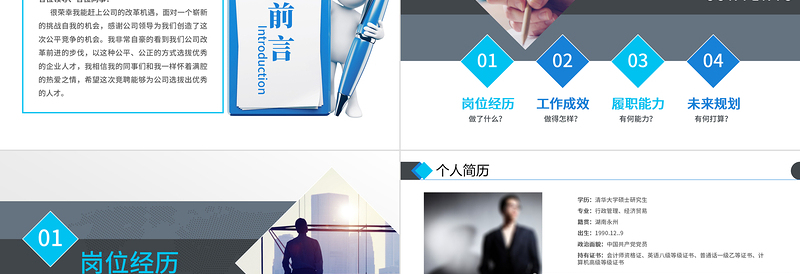 <p>延時符王曉明高管競聘競聘報告內部競聘崗位競聘崗位競聘JOBCOMPETITION為夢想勇往直前</p><br><p>前言Introduction各位領導、各位同事: 很榮幸我能趕上公司的改革機遇,面對一個嶄新的挑戰自我的機會,感謝公司領導為我們創造了這次公平競爭的機會。我非常自豪的看到我們公司改革前進的步伐,以這種公平、公正的方式選拔優秀的企業人才,我相信我的同事們和我一樣懷著滿腔的熱愛之情,希望這次競聘能夠為公司選拔出優秀的人才。</p><br><p>CONTENTS目錄崗位經歷工作成效履職能力未來規劃做了什么?做得怎樣?有何能力?有何打算?01020304</p><br><p>延時符崗位經歷個人簡歷崗位經歷重要項目經驗01崗位經驗</p><br><p>個人簡歷待用名現任崗位:崗位名稱學歷:清華大學碩士研究生出生:1990.12..9持有證書:會計師資格證、英語八級等級證書、普通話一級乙等證書、計算機高級等級證書籍貫:湖南永州專業:行政管理、經濟貿易技能表現創造能力管理能力協調能力營銷能力政治面貌:中國共產黨黨員</p><br><p>個人簡歷激情責任愛心自我評價高效自我評價并不等同于自我介紹,自我介紹可以非常詳細地介紹自己的特點,篇幅可長可短。自我評價則篇幅短,具有概括力強、針對性強等特點。從人力資源部門的角度來看,他們不會對長篇大論的自我介紹感興趣,他們只關心求職者最核心的特長與優勢。</p><br><p>崗位經歷Kingpub專業設計、品質保證……列舉您在此公司的主要成績,主要職責是什么取得過怎樣的成績或作出過哪些貢獻200X.9—200X.5您任職的公司名稱200X.3-200X.12200X.10-200X.6Kingpub專業設計、品質保證……列舉您在此公司的主要成績,主要職責是什么取得過怎樣的成績或作出過哪些貢獻您任職的公司名稱Kingpub專業設計、品質保證……列舉您在此公司的主要成績,主要職責是什么取得過怎樣的成績或作出過哪些貢獻您任職的公司名稱</p><br><p>Kingpub專業設計、品質保證……列舉您在此公司的主要成績,主要職責是什么取得過怎樣的成績或作出過哪些貢獻201X.3-200X.12您任職的公司名稱201X.9-200X.5201X.1-201X.2Kingpub專業設計、品質保證……列舉您在此公司的主要成績,主要職責是什么取得過怎樣的成績或作出過哪些貢獻您任職的公司名稱Kingpub專業設計、品質保證……列舉您在此公司的主要成績,主要職責是什么取得過怎樣的成績或作出過哪些貢獻您任職的公司名稱201X.1-201X.8Kingpub專業設計、品質保證……列舉您在此公司的主要成績,主要職責是什么取得過怎樣的成績或作出過哪些貢獻您任職的公司名稱</p><br><p>崗位經驗經驗值5年+四個項目上的管理經驗總共達到5年三個月項目管理經驗值2年+兩個崗位上做市場經營相關工作,累積達到兩年半時間市場經營經驗值1年+在總經辦、人力資源辦等崗位累積一年半時間的經驗辦公系統</p><br><p>重要項目經驗點擊輸入簡要文字內容,言簡意賅的說明分項內容KINGPUB專業設計……點擊輸入簡要文字內容,言簡意賅的說明分項內容KINGPUB專業設計……點擊輸入簡要文字內容,言簡意賅的說明分項內容KINGPUB專業設計……點擊輸入簡要文字內容,言簡意賅的說明分項內容KINGPUB專業設計……點擊輸入簡要文字內容,言簡意賅的說明分項內容KINGPUB專業設計……點擊輸入簡要文字內容,言簡意賅的說明分項內容KINGPUB專業設計……重大項目</p><br><p>工作成效獲得獎項與榮譽思想成長情況工作成效02延時符</p><br><p>獲得獎項與榮譽2009年在某公司獲得“關于什么”的榮譽或獎勵2012年在某公司獲得“關于什么”的榮譽或獎勵2014年在某公司獲得“關于什么”的榮譽或獎勵2015年在某公司獲得“關于什么”的榮譽或獎勵2016年在某公司獲得“關于什么”的榮譽或獎勵12345</p><br><p>思想成長參加工作六年是思想逐步走向成熟的六年,無論在哪個崗位,我始終認真貫徹黨的方針政策和公司的各項要求,始終保持學習的心態,在學習中領悟,在時間中提升;確保自身思想與行動和公司始終保持一致。自身的政治素養也在學習中不斷提高,工作能力態度與信仰也更加堅定。一個人的心胸有多寬,他生活的天地就有多廣;一個人的志向有多高,他的能力就有多強;一個人的人生目標有多遠,他的意志就能支持他走多久。持續學習 逐步成熟</p><br><p>思想成長政治覺悟點擊輸入簡要文字,言簡意賅的說明分項內容, KINGPUB專業設計KINGPUB專業設計……輸入簡要文字,言簡意賅的說明分項內容點擊輸入簡要文字,言簡意賅的說明分項內容, KINGPUB專業設計工作作風點擊輸入簡要文字,言簡意賅的說明分項內容, KINGPUB專業設計KINGPUB專業設計……輸入簡要文字,言簡意賅的說明分項內容點擊輸入簡要文字,言簡意賅的說明分項內容, KINGPUB專業設計廉潔奉公點擊輸入簡要文字,言簡意賅的說明分項內容, KINGPUB專業設計KINGPUB專業設計……輸入簡要文字,言簡意賅的說明分項內容點擊輸入簡要文字,言簡意賅的說明分項內容, KINGPUB專業設計</p><br><p>思想成長崗位行動成效在任何一個崗位,無論實在市場經營、項目管理或者文秘助理崗位上,我都能自覺主動的學習新知識,堅持理論學習與工作實踐相結合,切實在學以致用上下工夫。“適應、主動、創造、規范”是我的行動準則,在努力做到此標準的基礎之上豐富并提高了自己的管理和服務能力,在辦文、辦事、辦會和協作能力上都有很大的提升。入職六