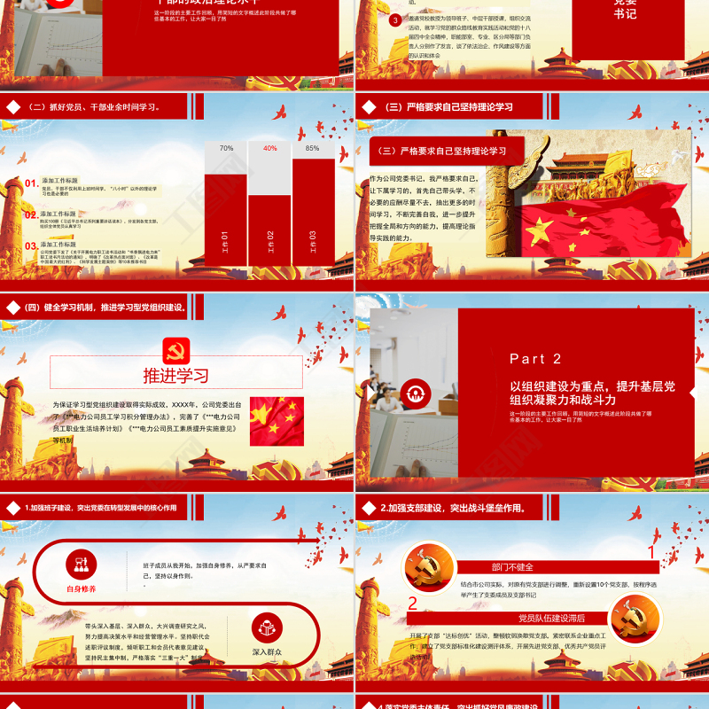 這一階段的主要工作回顧,用簡短的文字概述此階段共做了哪些基本的工作,讓大家一目了然Part 2以組織建設為重點,提升基層黨組織凝聚力和戰斗力
