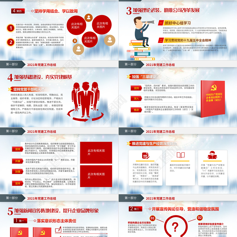 2021年黨建工作總結第一部分100周年主題活動把黨史學習教育作為一項重大政治任務,第一時間成立領導小組、召開動員大會、印發實施方案,開展某次專題學習,黨委主要負責同志帶頭講專題黨課,以“關鍵少數”示范帶動“絕大多數”,興起黨史學習教育熱潮。開展慶祝中國共產黨成立100周年各類主題活動,積極營造濃厚節日氛圍,視頻直播觀看相關領導總書記“七一”重要講話精神,各基層黨支部以“三會一課”開展學習研討,推動學習貫徹“七一”講話精神走深走實。