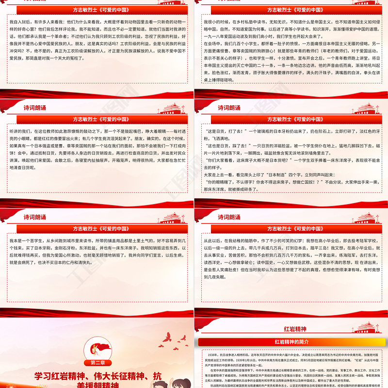 詩(shī)詞朗誦方志敏烈士《可愛(ài)的中國(guó)》我本是一個(gè)苦學(xué)生,從鄉(xiāng)間跑到城市里來(lái)讀書(shū),所帶的鋪蓋用品都是土里土氣的,好不容易弄到幾個(gè)錢(qián)來(lái),買(mǎi)了日本牙刷,金剛石牙粉,東洋臉盆,并也有一床東洋席子。我明知銷毀這些東西,以后就難得錢(qián)再買(mǎi),但我為愛(ài)國(guó)心所激動(dòng),也就毫無(wú)顧惜地銷毀了。我并向同學(xué)們宣言,以后生病,就是會(huì)病死了,也決不買(mǎi)日本的仁丹和清快丸。