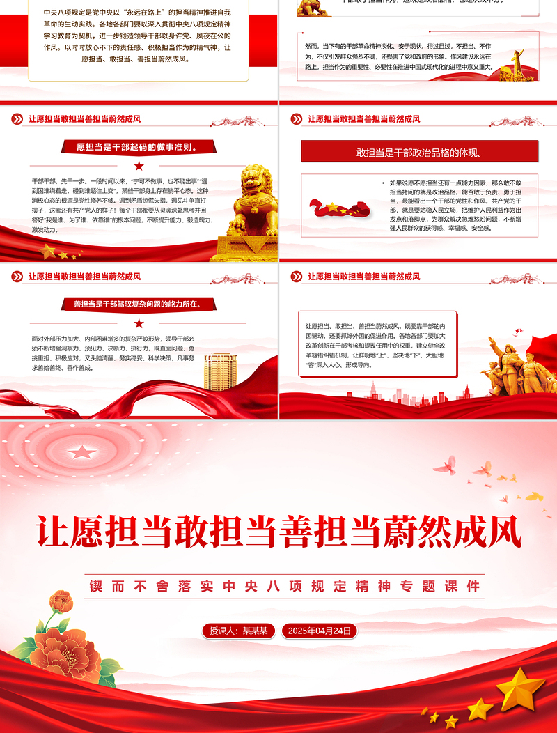 工圖網(wǎng)提供讓愿擔(dān)當(dāng)敢擔(dān)當(dāng)善擔(dān)當(dāng)蔚然成風(fēng)PPT中央八項(xiàng)規(guī)定精神學(xué)習(xí)教育專題課件供會(huì)員免費(fèi)下載。更多精彩黨課PPT素材,盡在工圖網(wǎng)。