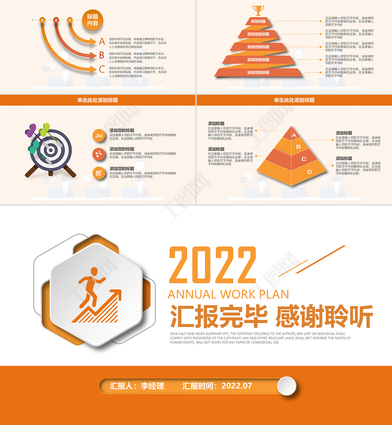2019 HALF YEAR WORK SUMMARY PPT, THE COPYRIGHT BELONGS TO THE AUTHOR, ANY UNIT OR INDIVIDUAL SHALL COMPLY WITH PROVISIONS OF THE COPYRIGHT LAW AND OTHER RELEVANT LAWS, SHALL NOT INFRINGE THE RIGHTS OF HUMAN RIGHTS, WILL NOT WORK FOR ANY FORM OF COMMERCIAL USE.ANNUAL WORK PLAN匯報完畢 感謝聆聽2022匯報人:李經理 匯報時間:2022.07