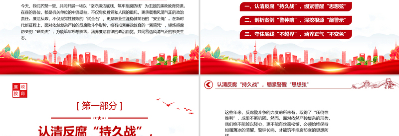 今天,我們齊聚一堂,共同開展一場以“堅守廉潔底線,筑牢拒腐防線”為主題的廉政教育黨課。在座的各位,都是機關單位的中流砥柱,不僅肩負著黨和人民的重托,更承載著風清氣正的政治責任。廉潔從政,不僅是黨性錘煉的“試金石”,更是職業生涯穩健前行的“安全繩”。在新時代新征程上,面對依然復雜嚴峻的反腐敗斗爭形勢,唯有扣緊廉政教育的“緊箍咒”,錘煉拒腐防變的“硬功夫”,方能筑牢思想防線,涵養廉潔自律的政治自覺,共同營造風清氣正的機關生態。前 言 PREFACE