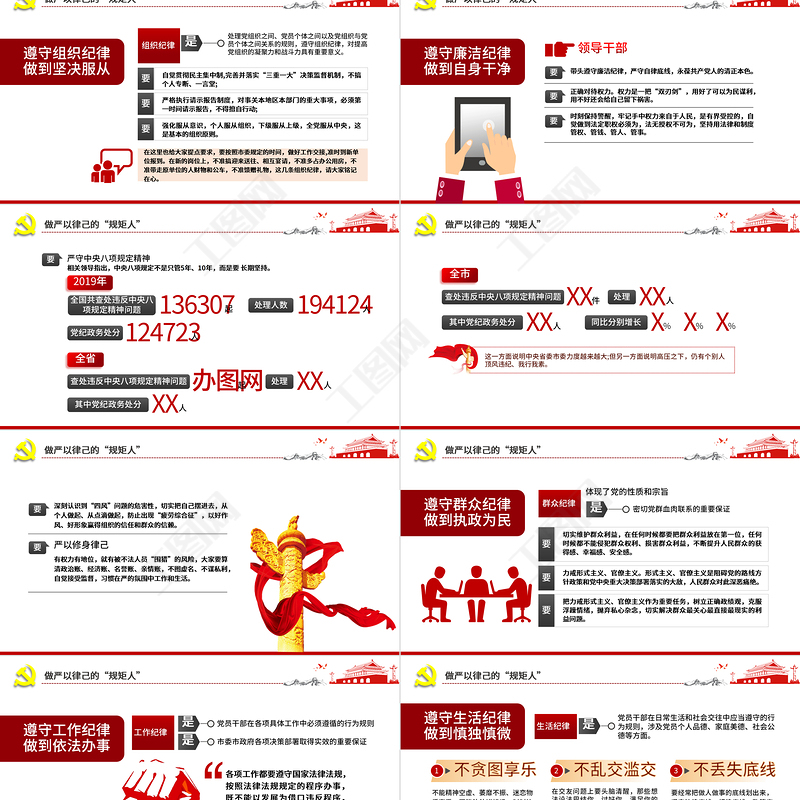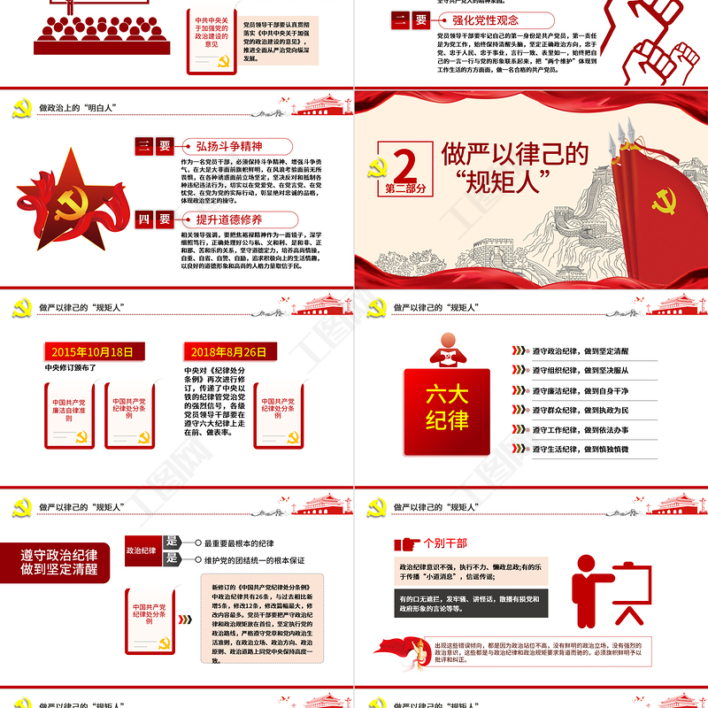 做嚴以律己的“規矩人” 六大紀律遵守政治紀律,做到堅定清醒遵守組織紀律,做到堅決服從遵守廉潔紀律,做到自身干凈遵守群眾紀律,做到執政為民遵守工作紀律,做到依法辦事遵守生活紀律,做到慎獨慎微