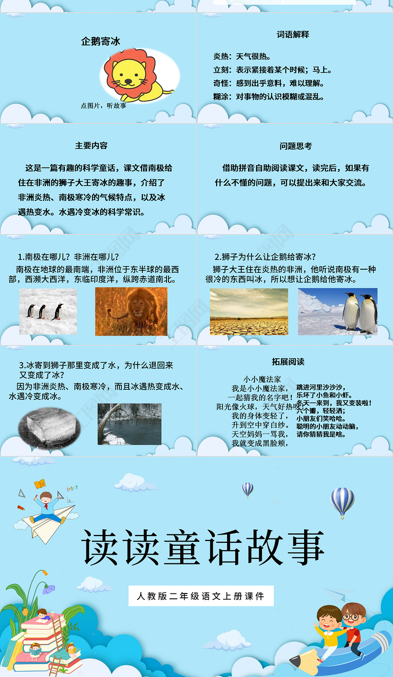 這是一篇有趣的科學童話,課文借南極給住在非洲的獅子大王寄冰的趣事,介紹了非洲炎熱、南極寒冷的氣候特點,以及冰遇熱變水。水遇冷變冰的科學常識。主要內容
