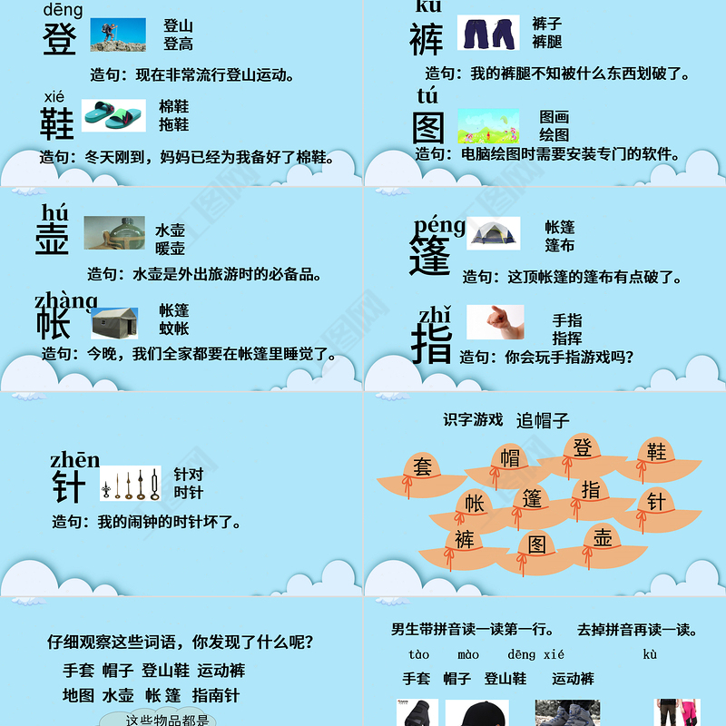 手套 帽子 登山鞋 運動褲 tào mào dēnɡ xié kù地圖 水壺 帳 篷 指南針 tú hú zhànɡ pénɡ zhǐ zhēn這4個詞語都是為戶外活動準備的著裝。這4個詞語是為戶外活動準備的用具。