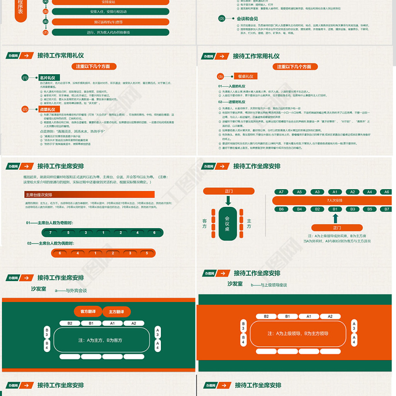 A7A5A3A1A2A4A6B6B4B2B1B3B5B77人次安排正門注:A為上級(jí)領(lǐng)導(dǎo)或外賓席,B為主方席當(dāng)A為外賓時(shí),A3與B3分別為客方與主方譯員正門接待工作坐席安排