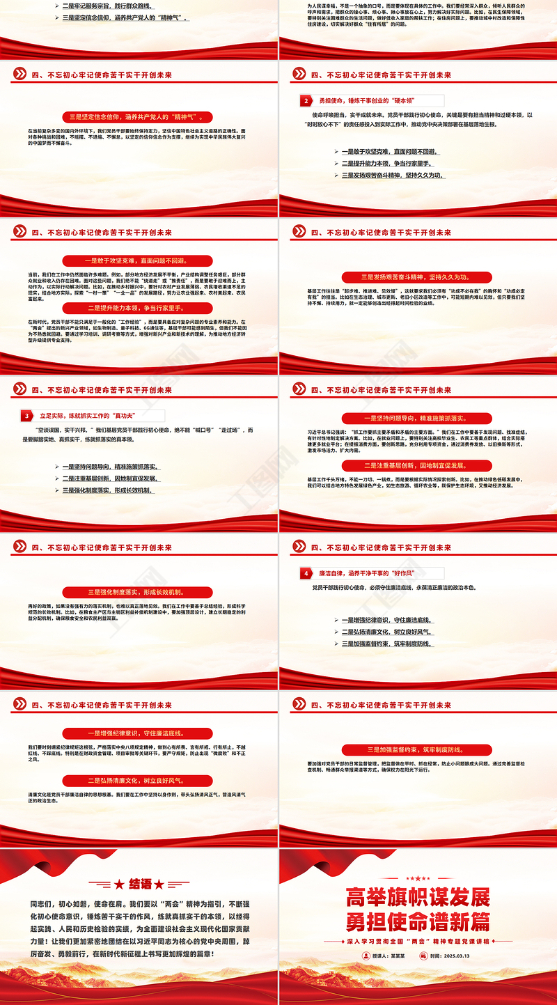 四、不忘初心牢記使命苦干實干開創未來一是敢于攻堅克難,直面問題不回避。當前,我們在工作中仍然面臨許多難題。例如,部分地方經濟發展不平衡,產業結構調整任務艱巨,部分群眾就業和收入仍存在困難。面對這些問題,我們絕不能“繞道走”或“推責任”,而是要敢于迎難而上,主動作為,以實際行動解決問題。比如,在推動鄉村振興中,要針對農村產業發展薄弱、農民增收渠道不足的現實,結合地方實際,探索“一村一策”“一業一品”的發展路徑,努力讓農業強起來、農村美起來、農民富起來。二是提升能力本領,爭當行家里手。在新時代,黨員干部不能只滿足于一般化的“工作經驗”,而是要具備應對復雜問題的專業素養和能力。在“兩會”提出的新興產業領域,如生物制造、量子科技、6G通信等,基層干部可能感到陌生,但我們不能因為不熟悉就回避。要通過學習培訓、調研考察等方式,增強對新興產業和新技術的理解,為推動地方經濟轉型升級提供專業支持。