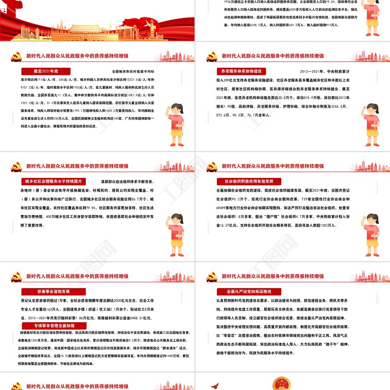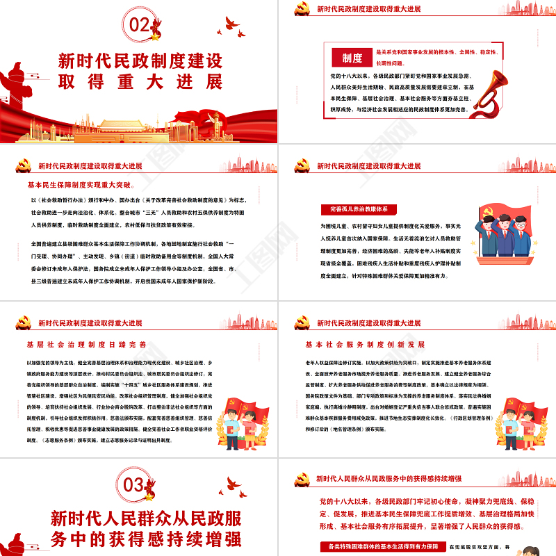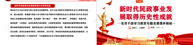 <p>—黨員干部學習教育專題黨課課件模板—新時代民政事業發展取得歷史性成就</p><br><p>前 言黨的十八大以來,以習近平同志為核心的黨中央高度重視民政工作,習近平總書記多次作出重要指示批示,為新時代民政事業發展提供了根本遵循。各級民政部門堅持以習近平新時代中國特色社會主義思想為指導,認真學習貫徹習近平總書記對民政工作重要指示批示精神,全面貫徹落實黨中央、國務院決策部署,牢記初心宗旨、擔當使命任務,革弊鼎新、攻堅克難,推動民政事業發展取得新進展新成績,有力服務了改革發展穩定大局。</p><br><p>目錄010203</p><br><p>新時代民政理論建設取得重大成果</p><br><p>新時代孕育新思想,新思想指導新實踐黨的十八大以來,習近平總書記對民政工作作出系列重要指示批示,深刻闡明民政部門和民政工作的政治屬性、職責定位、宗旨使命、目標方向、著力重點、任務舉措、發展動力、條件保障等重大理論和實踐問題,豐富發展了黨的民政工作理論。各級民政部門自覺強化思想理論武裝,將學習領會習近平總書記對民政工作重要指示批示精神作為必修課,在持續學習中深化理解、真信篤行,對民政工作的規律性認識達到了新高度。新時代民政理論建設取得重大成果</p><br><p>堅持和加強黨對民政工作的全面領導習近平總書記指出,“中國特色社會主義最本質的特征是中國共產黨領導,中國特色社會主義制度的最大優勢是中國共產黨領導”,“辦好中國的事情,關鍵在黨,關鍵在堅持黨要管黨、全面從嚴治黨”,要求“各級黨委和政府要堅持以人民為中心,加強對民政工作的領導”,“把黨的領導和我國社會主義制度優勢轉化為社會治理效能”等,深刻揭示了黨的領導是做好黨和國家各項工作的根本保證。通過深入學習領會,各級民政部門更加堅定地把加強黨對民政工作的全面領導作為根本要求,完善堅持黨的領導的體制機制,自覺對標對表習近平總書記重要指示批示精神和黨中央決策部署,謀劃民政發展、制定民政政策、部署民政工作,以實際行動推進全面從嚴治黨向縱深發展,為民政事業高質量發展提供堅強政治保證。新時代民政理論建設取得重大成果</p><br><p>堅持以人民為中心的發展思想習近平總書記指出,“讓人民生活幸福是‘國之大者’”;要“堅持人民至上,堅持共同富裕,把增進民生福祉、促進社會公平作為發展社會保障事業的根本出發點和落腳點,使改革發展成果更多更公平惠及全體人民”;強調“民政工作關系民生、連著民心”,各級黨委和政府要堅持以人民為中心,推動民政事業持續健康發展;“對各類困難群眾,我們要格外關注、格外關愛、格外關心”等,深刻詮釋了我們黨的根本宗旨。通過深入學習領會,各級民政部門更加深刻地認識到民政工作體現黨的初心使命,必須踐行“民政為民、民政愛民”工作理念,把群眾關切作為工作的“晴雨表”,把群眾滿意作為工作的“度量衡”,用心用情用力開展工作,更好傳遞黨和政府的溫暖,彰顯制度優勢。新時代民政理論建設取得重大成果</p><br><p>堅持社會建設兜底夯基的基本定位習近平總書記明確指出,要按照“五位一體”總體布局,促進現代化建設各方面相協調,促進生產關系與生產力、上層建筑與經濟基礎相協調;要加強社會建設,切實推進各項社會事業,努力形成全體人民各盡其能、各得其所而又和諧相處的局面;要“注重加強普惠性、兜底性、基礎性民生建設”,“要夯實社會治理基層基礎,推動社會治理重心下移,構建黨組織領導的共建共治共享的城鄉基層治理格局”;強調民政工作是社會建設的兜底性、基礎性工作,各級民政部門要更好履行基本民生保障、基層社會治理、基本社會服務等職責,進一步標定了新時代民政工作的全局定位。通過深入學習領會,各級民政部門深刻認識民政工作對社會建設的兜底夯基作用,自覺胸懷“國之大者”,立足“五位一體”總體布局,全力保障基本民生,創新社會治理,發展社會服務,切實服務黨和國家工作大局。新時代民政理論建設取得重大成果</p><br><p>堅持實事求是、科學精準習近平總書記指出,“我們過去取得的一切成就都是靠實事求是。今天,我們要把中國特色社會主義事業繼續推向前進,還是要靠實事求是”,“全黨同志一定要把實事求是貫穿到各項工作中去”;“堅持實事求是,既盡力而為又量力而行,把提高社會保障水平建立在經濟和財力可持續增長的基礎之上,不脫離實際、超越階段”;要“健全社會救助、社會福利對象精準認定機制”,“確保兜住底、兜準底、兜好底”等,對貫徹實事求是的思想路線和科學精準的工作方法作出了明確指導。通過深入學習領會,各級民政部門深刻領悟到做好民政工作,必須堅持實事求是,把一切從實際出發作為想問題、作決策、辦事情的出發點和落腳點,更好把握經濟發展和社會保障水漲船高的關系,養成精準思維習慣,用精準化對策破解難題,用精細化部署推動工作,推進各項民政工作持續高質量發展。新時代民政理論建設取得重大成果</p><br><p>堅持與時俱進、改革創新習近平總書記指出,“在新的時代條件下,我們要進行偉大斗爭、建設偉大工程、推進偉大事業、實現偉大夢想,仍然需要保持和發揚馬克思主義政黨與時俱進的理論品格”,強調要“堅持改革創新、與時俱進,善于自我完善、自我發