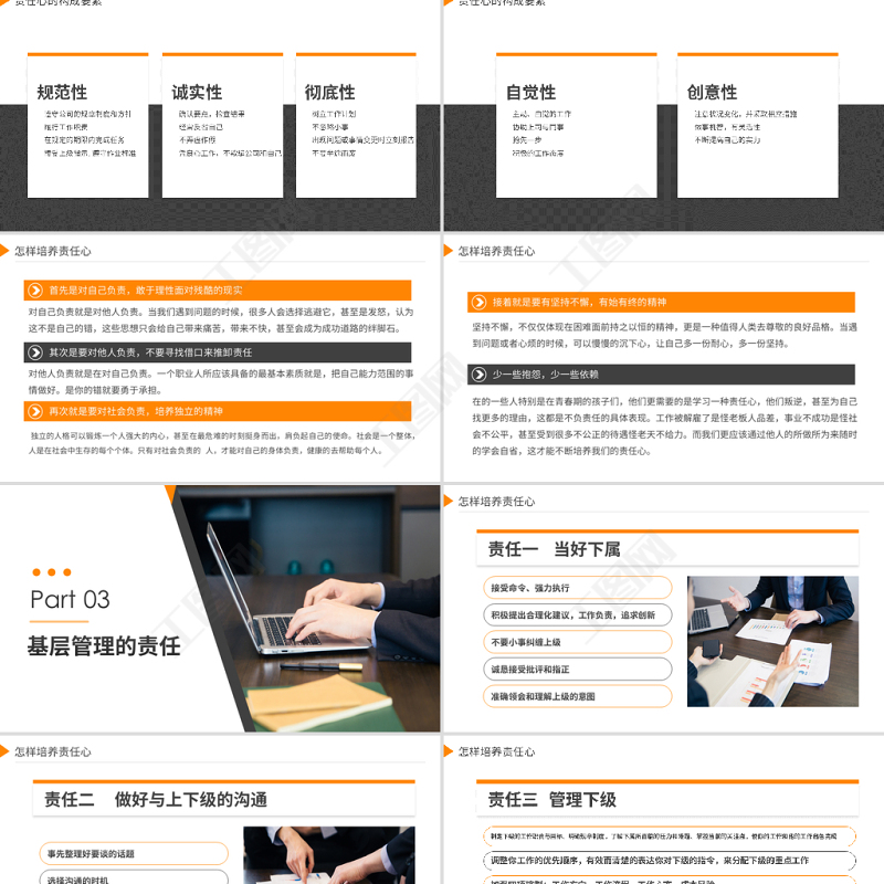工圖網(wǎng)提供原創(chuàng)企業(yè)員工工作責(zé)任心塑造培訓(xùn)課件PPT模板-版權(quán)可商用供會(huì)員免費(fèi)下載。更多精彩黨課PPT素材,盡在工圖網(wǎng)。