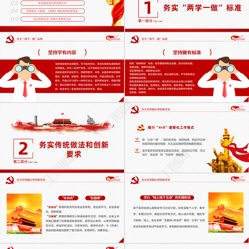 務(wù)實“兩學(xué)一做”標準按照“四講四有”標準,黨員要做到政治合格、執(zhí)行紀律合格、品德合格、發(fā)揮作用合格。堅定理想信念,站穩(wěn)政治立場;增強組織紀律性,執(zhí)行黨的決定,服從組織分配,嚴守黨的政治紀律和政治規(guī)矩;繼承發(fā)揚黨的優(yōu)良傳統(tǒng)和作風(fēng),帶頭踐行社會主義核心價值觀;牢記黨的根本宗旨,愛崗敬業(yè)、履職盡責(zé)、服務(wù)師生、奉獻社會,敢擔(dān)當(dāng)、敢負責(zé)、敢作為,在促進藝術(shù)教育事業(yè)發(fā)展中作表率、當(dāng)先鋒、樹榜樣。堅持做有標準