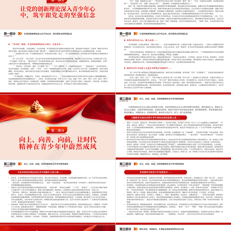 前言火熱的青春,需要堅定的理想信念。 青年理想遠大、信念堅定,是一個國家、一個民族無堅不摧的前進動力。黨的十八大以來,共青團以習近平新時代中國特色社會主義思想為指導,深入貫徹落實習近平總書記關(guān)于青年工作的重要思想,切實增強“四個意識”、堅定“四個自信”、做到“兩個維護”,牢牢把握為黨培養(yǎng)中國特色社會主義事業(yè)合格建設者和可靠接班人的根本任務,遵循思想政治工作規(guī)律和青少年成長規(guī)律,突出理想信念教育,彰顯實踐育人特色,建強網(wǎng)上引領(lǐng)陣地,落實意識形態(tài)工作責任制,全團動手、守正創(chuàng)新,面向基層、面向?qū)嶋H,引導廣大青少年堅定聽黨話、跟黨走。QIAN YAN面對世界百年未有之大變局和中華民族偉大復興戰(zhàn)略全局,面對更加自信自強、富于思辨精神,同時被各種社會思潮影響的新時代青年,共青團作為廣大青年在實踐中學習中國特色社會主義和共產(chǎn)主義的學校,肩負著為黨育人的使命任務。