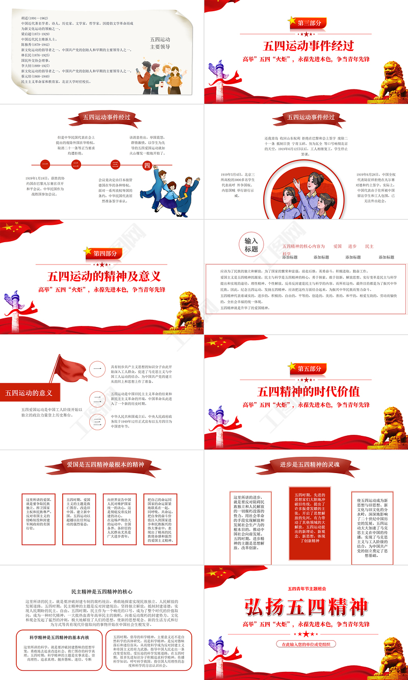 工圖網提供弘揚五四精神PPT高舉五四火炬永葆先進本色專題課件模板供會員免費下載。更多精彩黨課PPT素材,盡在工圖網。