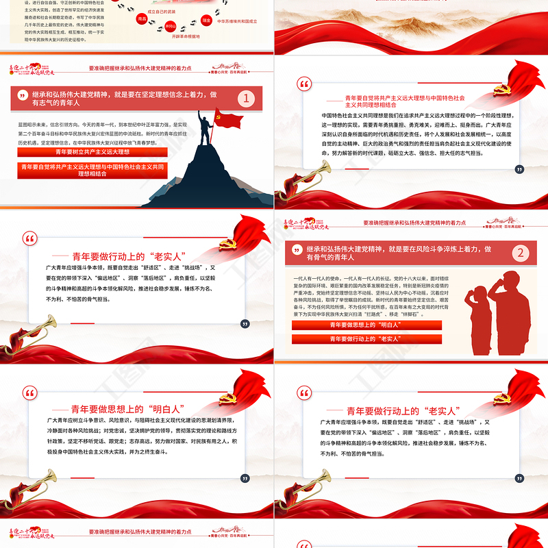 PREFACE前言 習近平總書記在慶祝中國共產黨成立100周年大會上,追溯我們黨的精神之源,首次提出“堅持真理、堅守理想,踐行初心、擔當使命,不怕犧牲、英勇斗爭,對黨忠誠、不負人民”的偉大建黨精神。偉大建黨精神,是中國共產黨先驅在20世紀20年代探索救國救民道路中創造的寶貴精神財富,凝聚著中國共產黨人的初心和使命。作為新時代的青年,我們要深入領會把握偉大建黨精神的深刻內涵、時代價值和實踐要求,凝聚起奮進新征程、創造新業績的強大精神力量。