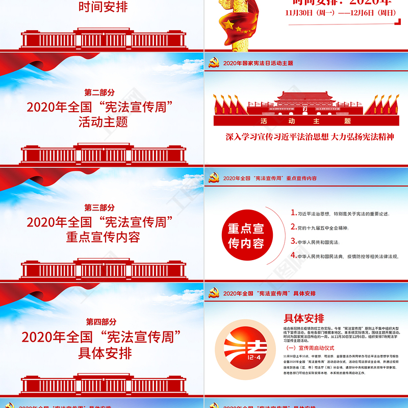 <p>2020年國家憲法日-XXX黨支部--深入學習宣傳法治思想 大力弘揚憲法精神-</p><br><p>前言為深入學習貫徹黨的十九大和十九屆二中、三中、四中、五中全會精神,深入學習宣傳法治思想,弘揚憲法精神,維護憲法權威,推動憲法全面實施,今年將在12月4日國家憲法日前后繼續(xù)組織開展“憲法宣傳周”活動。經(jīng)商中央有關部門,中宣部、司法部、全國普法辦研究制定工作方案如下:</p><br><p>目錄CONTENTS第一部分第二部分第三部分時間安排活動主題重點宣傳內(nèi)容第四部分具體安排第五部分宣傳報道第六部分工作要求</p><br><p>2020年全國“憲法宣傳周”時間安排第一部分</p><br><p>2020年全國“憲法宣傳周”時間安排時間安排:2020年11月30日(周一)——12月6日(周日)</p><br><p>2020年全國“憲法宣傳周”活動主題第二部分</p><br><p>2020年國家憲法日活動主題深入學習宣傳法治思想 大力弘揚憲法精神活 動 主 題</p><br><p>2020年全國“憲法宣傳周”重點宣傳內(nèi)容第三部分</p><br><p>2020年全國“憲法宣傳周”重點宣傳內(nèi)容重點宣傳內(nèi)容1.法治思想,特別是關于憲法的重要論述;2.黨的十九屆五中全會精神;3.中華人民共和國憲法;4.中華人民共和國民法典,疫情防控等相關法律法規(guī)。</p><br><p>2020年全國“憲法宣傳周”具體安排第四部分</p><br><p>2020年全國“憲法宣傳周”具體安排具體安排結(jié)合新冠肺炎疫情防控工作實際,今年“憲法宣傳周”原則上不集中組織大型線下宣傳活動,各地各部門根據(jù)本地區(qū)、本系統(tǒng)實際情況,圍繞主題開展活動。時間為國家憲法日所在的一周,從11月30日至12月6日,組織安排7場憲法學習宣傳主題活動。(一)宣傳周啟動儀式11月30日上午10點,中宣部、司法部、全國普法辦共同舉辦法治思想學習報告會暨2020年全國“憲法宣傳周”活動啟動儀式,活動在司法部設主會場,并通過視頻連線到各省(區(qū)、市)司法廳(局)分會場。請部分中央和國家機關領導干部參加。各地各部門可結(jié)合實際安排本地、本系統(tǒng)的宣傳周啟動工作。</p><br><p>2020年全國“憲法宣傳周”具體安排(二)國家憲法日座談會12月4日,組織召開國家憲法日座談會。(三)憲法學習宣傳主題活動根據(jù)黨中央關于推動憲法學習宣傳教育的有關精神,2020年“憲法宣傳周”舉辦七場主題活動,分別是:憲法進企業(yè)、憲法進農(nóng)村、憲法進機關、憲法進校園、憲法進社區(qū)、憲法進軍營、憲法進網(wǎng)絡。各主題活動由司法部、全國普法辦統(tǒng)一協(xié)調(diào)安排,相關部門牽頭負責,有關地方司法廳(局)配合主辦。各地各部門要高度重視,加強組織協(xié)調(diào),要綜合考慮地方實際和新冠肺炎疫情防控情況,圍繞宣傳主題,細化宣傳內(nèi)容,組織實施既有地方特色又具有良好社會影響的法治宣傳活動。具體時間安排、開展活動形式可根據(jù)實際情況,商全國普法辦進行調(diào)整。宣傳活動安排請報全國普法辦,納入“憲法宣傳周”總體工作方案并向媒體發(fā)布。</p><br><p>2020年全國“憲法宣傳周”具體安排憲法進企業(yè)主題活動1基本要求:結(jié)合企業(yè)法治文化建設,面向國有企業(yè)、民營企業(yè)經(jīng)營管理人員和職工,突出宣傳“法治是最好的營商環(huán)境”、推動“一帶一路”戰(zhàn)略實施、集中展示民營經(jīng)濟法治建設和構建和諧勞動關系的法治保障成果,憲法法律對國有經(jīng)濟、非公有制經(jīng)濟的保障和規(guī)范和對勞動者權益的保障,優(yōu)化營商環(huán)境法律法規(guī),法治企業(yè)建設等。全國工商聯(lián)組織開設民營經(jīng)濟法治建設專場。全國總工會組織開展全國工會“憲法進企業(yè)”主題活動。牽頭單位:國務院國資委全國工商聯(lián)全國總工會</p><br><p>2020年全國“憲法宣傳周”具體安排憲法進農(nóng)村主題活動2基本要求:針對農(nóng)村群眾法治需求和關注的熱點問題,突出宣傳實施“鄉(xiāng)村振興”戰(zhàn)略和打贏脫貧攻堅戰(zhàn),憲法關于農(nóng)村農(nóng)業(yè)農(nóng)民的有關規(guī)定,法治鄉(xiāng)村建設等。結(jié)合“全國交通安全日”主題活動,深入開展農(nóng)村交通安全普法宣傳。牽頭單位:農(nóng)業(yè)農(nóng)村部</p><br><p>2020年全國“憲法宣傳周”具體安排憲法進機關主題活動3基本要求:結(jié)合學習貫徹黨的十九屆五中全會精神,深入學習法治思想,組織國家機關工作人員學習憲法知識,組織憲法宣誓活動,學習黨章和其他黨內(nèi)法規(guī),推動國家機關工作人員增強制度意識,依憲依法依規(guī)履職,做制度執(zhí)行的表率。牽頭單位:中央和國家機關工委</p><br><p>2020年全國“憲法宣傳周”具體安排憲法進校園主題活動4基本要求:在青少年學生中組織開展參與度高、具有儀式感的憲法宣傳活動。突出宣傳憲法基本原則、主要內(nèi)容,培育青少年學生的憲法意識、國家意識、規(guī)則意識。舉辦中小學校憲法晨讀活動,舉辦全國學生“學憲法講憲法”活動。牽頭單位:教育部</p><br><p>2020年全國“憲法宣傳周”具體安排憲法進社區(qū)主題活動5基本要求:針對社區(qū)群眾法治需求和關注的熱點問題,結(jié)合“憲法進萬家”活動,深入基層社區(qū)、家庭開展普法宣傳。突出宣傳憲法關于公民基本權利和義務的規(guī)定,關于居民委員會有關規(guī)定,推進基層