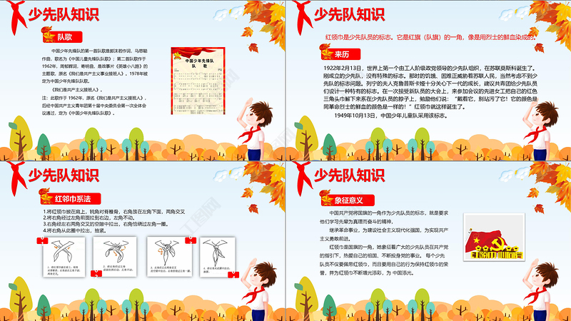 少先隊知識1949年10月13日,中國共產黨委托共青團建立全國統一的少年兒童組織——中國少年兒童隊。1953年6月,中國少年兒童隊改為中國少年先鋒隊,簡稱少先隊。少先隊繼承了革命戰爭年代兒童團的優良傳統,與過去的兒童團一樣,用紅領巾作為自己的標志。紅領巾是用中國人民的鮮血染紅的,它代表著無數英雄的心血。紅領巾是紅旗的一角,象征著革命的勝利。
