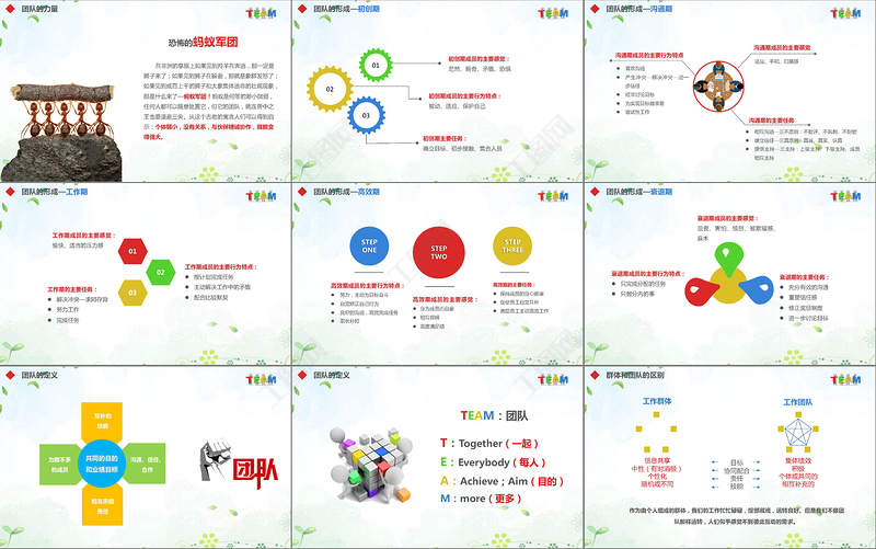 <p>企業培訓之有效管理團隊Effective management team</p><br><p>團隊的力量恐怖的螞蟻軍團 在非洲的草原上如果見到羚羊在奔逃,那一定是獅子來了;如果見到獅子在躲避,那就是象群發怒了;如果見到成百上千的獅子和大象集體逃命的壯觀現象,那是什么來了—螞蟻軍團!螞蟻是何等的渺小微弱,任何人都可以隨意處置它,但它的團隊,就連獸中之王也要退避三舍。從這個古老的寓言人們可以得到啟示:個體弱小,沒有關系,與伙伴精誠協作,就能變得強大。</p><br><p>團隊的形成—初創期010203初創期成員的主要感覺:茫然、新奇、矛盾、恐懼初創期成員的主要行為特點:被動、適應、保護自己初創期主要任務:確立目標、初步接觸、集合人員</p><br><p>團隊的形成—溝通期溝通期成員的主要感覺適應、平和、歸屬感溝通期的主要任務相互溝通—三不原則:不批評、不諷刺、不封鎖建立信任—三真原則:真誠、真實、認真提供支持—三支持:上級支持、下級支持、成員相互支持溝通期成員的主要行為特點喜歡溝通產生沖突—解決沖突—進一步信任經常討論目標為實現目標做準備嘗試性工作</p><br><p>團隊的形成—工作期010302工作期成員的主要感覺:愉快、適當的壓力感工作期成員的主要行為特點:按計劃完成任務主動解決工作中的矛盾配合比較默契工作期的主要任務:解決沖突—求同存異努力工作完成任務</p><br><p>團隊的形成—高效期STEP TWOSTEP ONESTEP THREE高效期成員的主要行為特點:努力,主動為目標奮斗自覺矯正自己行為良好的溝通,高效完成任務取長補短高效期成員的主要感覺:身為成員而自豪相互理解高度滿足感高效期的主要任務:保持成員的身心健康促使員工自覺互補激勵員工主動高效工作</p><br><p>團隊的形成—衰退期衰退期成員的主要行為特點:只完成分配的任務只做分內的事衰退期的主要任務:充分有效的溝通重塑信任感修正獎懲制度進一步討論目標衰退期成員的主要感覺:沮喪、害怕、憤怒、被欺騙感、麻木</p><br><p>團隊的定義共同的目的和業績目標溝通、信任、合作相互承擔責任為數不多的成員互補的技能</p><br><p>團隊的定義TEAM:團隊T:Together(一起)E:Everybody(每人)A:Achieve;Aim(目的)M:more(更多)</p><br><p>群體和團隊的區別工作群體工作團隊信息共享中性(有時消極)個性化隨機或不同集體績效積極個體或共同的相互補充的目標協同配合責任技能作為由個人組成的群體,我們的工作忙忙碌碌,按部就班,運轉良好。但是我們不像團隊那樣運轉,人們似乎感覺不到彼此互動的需求。</p><br><p>群體和團隊的區別領導方面目標方面協作方面作為群體應該有明確的領導人;團隊可能就不一樣,尤其團隊發展到成熟階段,成員共享決策權群體的目標必須跟組織保持一致,但團隊中除了這點以外,還可以產生自己的目標協作性是群體跟團隊最根本的差異,群體的協作性可能是中等程度的,有時成員還有些消極,有些對立;但團隊中是一種齊心協力的氣氛</p><br><p>群體和團隊的區別責任方面群體的領導者要負很大的責任,而團隊中除了領導者要負責任外,每一個團隊的成員也要負責,甚至要一起相互作用,共同負責技能方面群體成員的技能可能是不同的,也可能是相同的,而團隊成員的技能是互補的,把不同技能、知識和經驗的人綜合在一起,形成角色互補,從而達到整個團隊的有效組合結果方面群體的績效是每一個個體的績效相加之和,團隊的結果或績效是大家共同合作完成的產品</p><br><p>群體和團隊的區別工作表現團隊的效能工作群體偽團隊潛在團隊績優團隊偽團隊:一群人被別人或自己稱為團隊,也具有團隊潛力,但實際工作中根本不協作或根本無集體責任感潛在團隊:是介于工作群體和真正團隊之間的群體真正的團隊:由很少的一些人組成,他們為同一目的工作,有共同的目標,團隊中的每一個成員共同對團隊所要達到的目的負責,也對團隊采用總的工作方法負責績優團隊:是把團隊的潛力發揮到及至的團隊</p><br><p>高效團隊的特征高效團隊共享的領導共同的目標相互信任與尊重充分的溝通取長補短高效工作程序持續的學習靈活和適應</p><br><p>團隊的構成要素:目標(Purpose)目標是個人與組織進行某種活動所追求對象的具體標準。團隊應該有一個既定的目標,為團隊成員導航,知道要向何處去,沒有目標這個團隊就沒有存在的價值。團隊的目標就是要創造出比團隊成員個人所能創造出的總和更多的價值,這也是團隊存在的意義。</p><br><p>團隊的構成要素:人員(People) 人是構成團隊最核心的力量,2個(包含2個)以上的人就可以構成團隊。目標是通過人員具體實現的,所以人員的選擇是團隊中非常重要的一個部分。 高效績的團隊是由具備不同優勢、不同技能、人格各異的人組成,并根據組織的需要和團隊成員各自的特點分別擔任不同的崗位任務,通過團隊成員的分工協作保證整個團隊的高效運作。</p><br><p>角色管理010203人人能不斷進步,但無人能達到完美,但團隊可以通過不同角色的組合達到完美。團隊中的每個角色都是優點缺點相伴相生,領導要學會用人之長,容人之短。尊重角色差異,發揮個性特征,角色并無好壞之分,關鍵是要找到與角色特征相契合的工作。</p><br><p>團隊的定位團隊整體的定位—團隊在組織中處于什么位置,由誰選擇和決定團隊的成員,團隊最終對誰負責,團隊采取什么方式激勵下