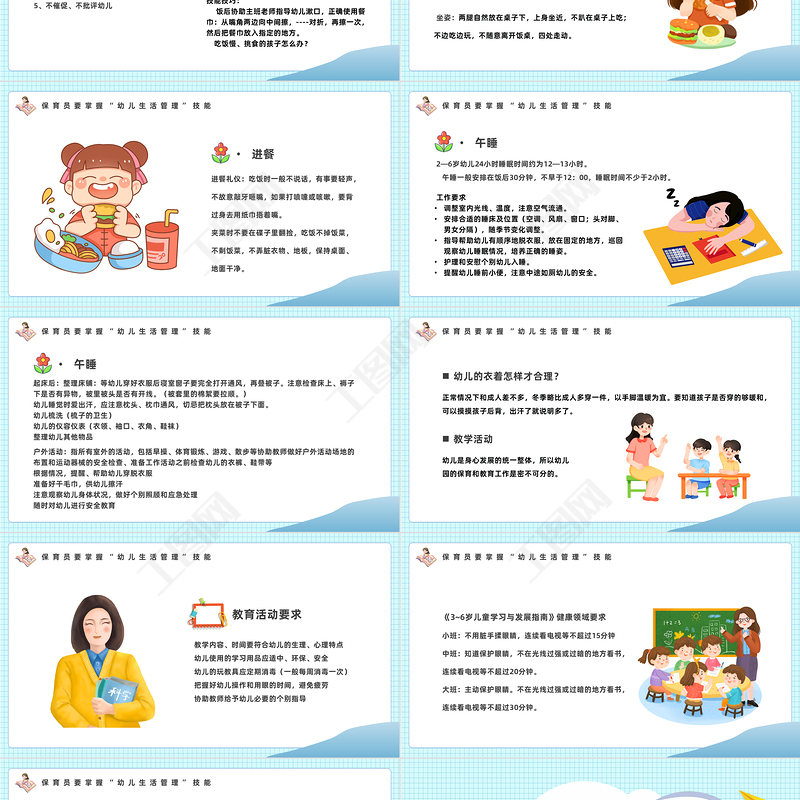 保育員要掌握“幼兒生活管理”技能 2—6歲幼兒24小時睡眠時間約為12—13小時。 午睡一般安排在飯后30分鐘,不早于12:00,睡眠時間不少于2小時。 工作要求 調整室內光線、溫度,注意空氣流通。 安排合適的睡床及位置(空調、風扇、窗口;頭對腳、男女分隔),隨季節變化調整。 指導幫助幼兒有順序地脫衣服,放在固定的地方,巡回觀察幼兒睡眠情況,培養正確的睡姿。 護理和安慰個別幼兒入睡。 提醒幼兒睡前小便,注意中途如廁幼兒的安全。