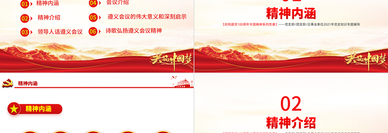 <p>遵義會議精神專題【慶祝建黨100周年中國精神系列黨課】——黨支部/團支部/企事業(yè)單位2021年黨史知識專題輔導</p><br><p>目 錄/MU LU</p><br><p>精神內涵01【慶祝建黨100周年中國精神系列黨課】——黨支部/團支部/企事業(yè)單位2021年黨史知識專題輔導</p><br><p>堅定信念實事求是獨立自主敢闖新路民主團結精神內涵</p><br><p>精神介紹02【慶祝建黨100周年中國精神系列黨課】——黨支部/團支部/企事業(yè)單位2021年黨史知識專題輔導</p><br><p>遵義會議精神的內涵及其當代價值運用好遵義會議歷史經驗 讓遵義會議精神永放光芒遵義會議精神:燭照征程 永放光芒遵義會議精神:歷史轉折 歷久彌新精神介紹</p><br><p>領導人話遵義會議03【慶祝建黨100周年中國精神系列黨課】——黨支部/團支部/企事業(yè)單位2021年黨史知識專題輔導</p><br><p>“遵義會議以后,在毛澤東同志領導下,我們黨建立了一套健全的黨的生活制度。比如民主集中制;團結——批評——團結的方法;言者無罪、聞者足戒,懲前毖后、治病救人;批判從嚴、處理從寬,不搞過火斗爭、無情打擊;艱苦樸素、謙虛謹慎,等等?!?——鄧小平《在擴大的中央工作會議上的講話》(1962年)領導人話遵義會議</p><br><p>“一九三五年一月黨中央政治局在長征途中舉行的遵義會議,確立了毛澤東同志在紅軍和黨中央的領導地位,使紅軍和黨中央得以在極其危急的情況下保存下來,并且在這以后能夠戰(zhàn)勝張國燾的分裂主義,勝利地完成長征,打開中國革命的新局面。這在黨的歷史上是一個生死攸關的轉折點?!?——鄧小平《關于建國以來黨的若干歷史問題的決議》(1981年6月)“遵義會議的更深遠的意義,還在于使我們的黨,首先是實行正確路線的核心領導人員,開始認識到:中國的革命,必須從自己的實際情況出發(fā),在馬克思列寧主義的指導下,走自己的道路。” ——楊尚昆在紀念遵義會議五十周年會上的講話(1985年1月)領導人話遵義會議</p><br><p>“長征途中,我們黨舉行的具有劃時代意義的遵義會議,……我們黨首先是中央領導集體開始自覺地認識到,只有把馬克思列寧主義的基本原理同中國具體實際結合起來,獨立自主地解決中國革命的重大問題,才能把革命事業(yè)引向勝利。” ——江澤民在紀念長征勝利60周年大會上的講話(1996年10月)“我們永遠不能忘記革命前輩為奪取中國革命勝利進行的艱苦卓絕斗爭和建立的豐功偉績。我們一定要大力弘揚遵義會議的優(yōu)良傳統(tǒng),堅定不移走中國特色社會主義道路,努力創(chuàng)造中國人民和中華民族更加幸福美好的未來。” ——胡錦濤瞻仰遵義會議會址(2012年12月) 領導人話遵義會議</p><br><p>會議介紹04【慶祝建黨100周年中國精神系列黨課】——黨支部/團支部/企事業(yè)單位2021年黨史知識專題輔導</p><br><p> 1935年1月15日至1月17日,中共中央政治局擴大會議在遵義老城子尹路黔軍師長柏輝章公館二樓會客室召開,參加會議的中央政治局委員有毛澤東、張聞天(洛甫)、周恩來、陳云、朱德、秦邦憲(博古);政治局候補委員有王稼祥、劉少奇、凱豐(何克全)、鄧發(fā);擴大參加者有紅軍總部和各軍團負責人李富春、劉伯承、林彪、聶榮臻、彭德懷、楊尚昆、李卓然;出席會議的還有《紅星報》主編鄧小平;共產國際駐中國的軍事顧問李德及其翻譯伍修權列席會議,與會者共20人。會議圍繞總結第五次反“圍剿”失敗的經驗教訓而展開。會議介紹</p><br><p>會上,首先由秦邦憲(博古)代表中央作《關于反對敵人第五次“圍剿”的總結》報告即主報告。他在報告中把第五次反“圍剿”失敗的主要原因,歸咎于帝國主義和國民黨反動派的力量強大,白區(qū)革命運動薄弱,各根據(jù)地之間配合不好等客觀原因上。而對軍事指揮上的錯誤缺乏認識,并為之辯護。接著,周恩來作副報告即軍事報告。周恩來指出第五次反“圍剿”失敗的主要原因是軍事領導上戰(zhàn)略戰(zhàn)術的錯誤,并主動承擔自己應該承擔的責任。張聞天根據(jù)會前與毛澤東、王稼祥商量的提綱在會上作批評“左”傾軍事錯誤的報告,亦稱“反報告”。張聞天在報告中列舉事實,說明中央紅軍第五次反“圍剿”的失敗以及退出蘇區(qū)后遭到嚴重損失的主要原因,是由于李德、博古在軍事上犯了一系列嚴重錯誤,違背紅軍過去在長期作戰(zhàn)中所形成的基本原則所造成的。兩個報告之后會議介紹</p><br><p>張聞天報告之后,毛澤東作長篇發(fā)言。毛澤東認為第五次反“圍剿”失敗的主要原因是由于軍事指揮上和戰(zhàn)略戰(zhàn)術上的錯誤造成的。指出在敵強我弱的情況下,紅軍應采取積極防御的戰(zhàn)略方針,集中優(yōu)勢兵力在運動中消滅敵人。在第五次反圍剿戰(zhàn)爭中,左傾領導人以單純防御路線代替決戰(zhàn)防御,以陣地戰(zhàn)、堡壘戰(zhàn)代替運動戰(zhàn),以所謂“短促突擊”的戰(zhàn)術原則支持單純防御的戰(zhàn)略路線;犯了進攻中的冒險主義、防御中的保守主義、退卻中的逃跑主義;與紅軍取得第一、二、三次反“圍剿”勝利的戰(zhàn)略戰(zhàn)術基本原則完全相違背。毛澤東的意見得到大多數(shù)與會者的贊同。王稼祥在會上旗幟鮮明地支持張聞天的“反報告”和毛澤東的發(fā)言。明確提意由毛澤東出來指揮紅軍。朱德在會上支持毛澤東的正確意見,他說:“如果繼續(xù)這