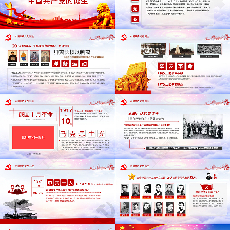 俄國十月革命October Revolution in Russia▲俄國十月革命的成功1917年,俄國爆發了十月革命這是人類歷史上第一次社會主義革命。隨后,蘇維埃政權在全國各地相繼建立,社會主義革命取得偉大勝利。十月革命不僅讓中國人民看到了社會主義是如何變成活生生現實的,更重要的是,還給中國送來了指路明燈——馬克思主義。我們至今耳熟能詳的一句話是:十月革命一聲炮響,給我們送來了馬克思列寧主義。從此,馬克思這個19世紀西方人的名字,在中國先進分子中越來越深入人心,他的思想的光亮,讓人們越來越清晰地看到了中國革命的方向、前進的道路。中國共產黨的誕生