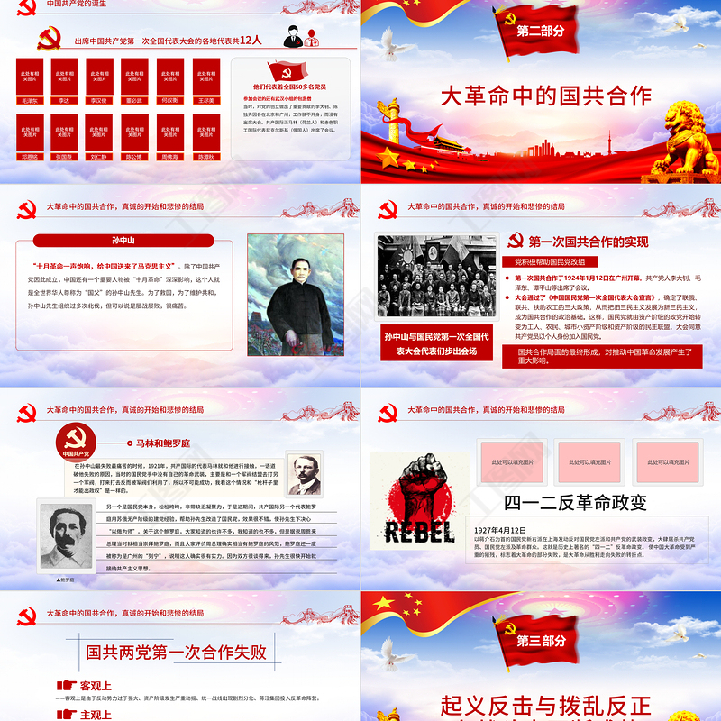 出席中國共產黨第一次全國代表大會的各地代表共12人參加會議的還有武漢小組的包惠僧當時,對黨的創立做出了重要貢獻的李大釗、陳獨秀因各在北京和廣州,工作脫不開身,而沒有出席大會。共產國際派馬林(荷蘭人)和赤色職工國際代表尼克爾斯基(俄國人)出席了會議。他們代表著全國50多名黨員此處有相關圖片此處有相關圖片此處有相關圖片此處有相關圖片此處有相關圖片此處有相關圖片此處有相關圖片此處有相關圖片此處有相關圖片此處有相關圖片此處有相關圖片此處有相關圖片中國共產黨的誕生