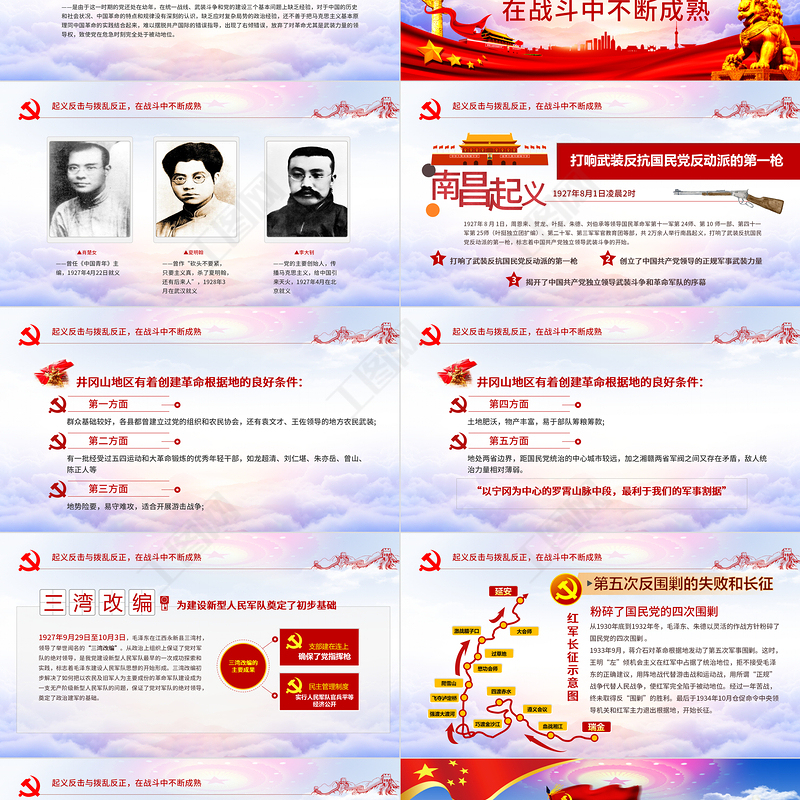 南昌起義1927年8月1日凌晨2時1927年 8 月 1日,周恩來、賀龍、葉挺、朱德、劉伯承等領導國民革命軍第十一軍第 24師、第 10 師一部、第四十一軍第 25師(葉挺獨立團擴編)、第二十軍、第三軍軍官教育團等部,共 2萬余人舉行南昌起義,打響了武裝反抗國民黨反動派的第一槍,標志著中國共產黨獨立領導武裝斗爭的開始。打響了武裝反抗國民黨反動派的第一槍創立了中國共產黨領導的正規軍事武裝力量揭開了中國共產黨獨立領導武裝斗爭和革命軍隊的序幕起義反擊與撥亂反正,在戰斗中不斷成熟