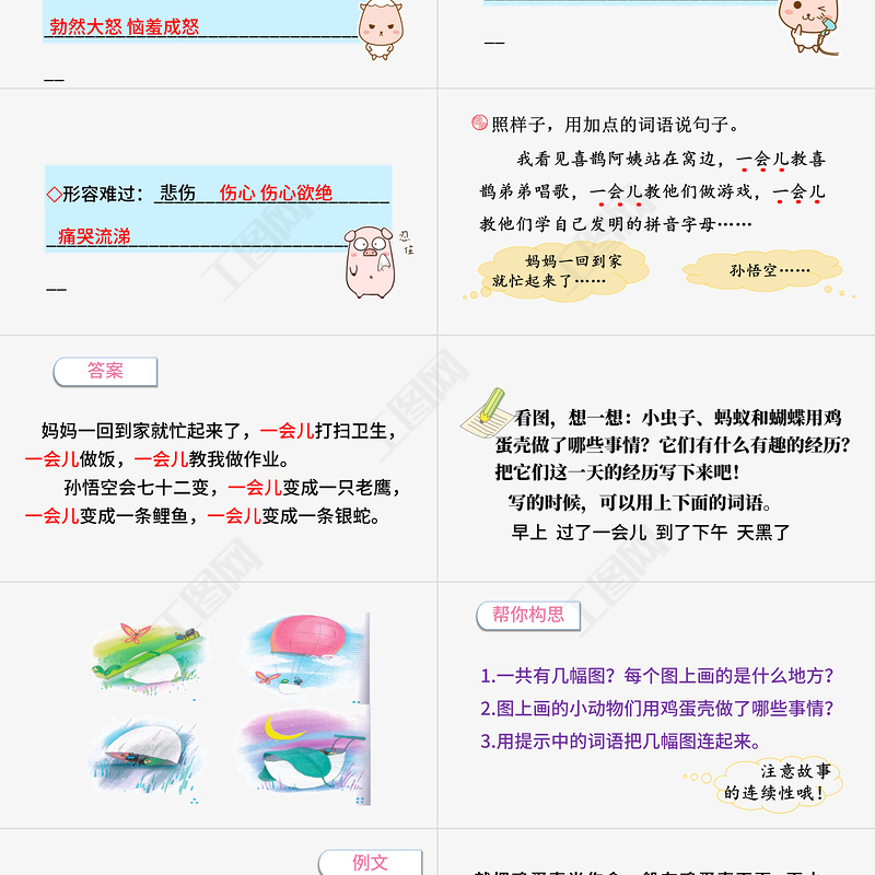 1.一共有幾幅圖?每個圖上畫的是什么地方? 2.圖上畫的小動物們用雞蛋殼做了哪些事情? 3.用提示中的詞語把幾幅圖連起來。幫你構思