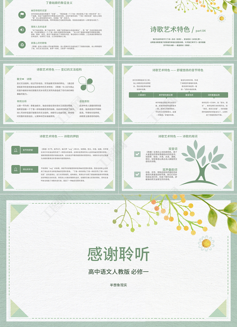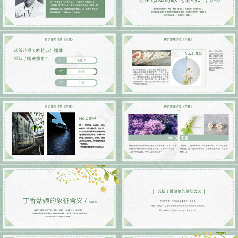 工圖網提供綠色清新簡約高中語文高一必修《必修一雨巷》教育教學課件PPT供會員免費下載。更多精彩黨課PPT素材,盡在工圖網。