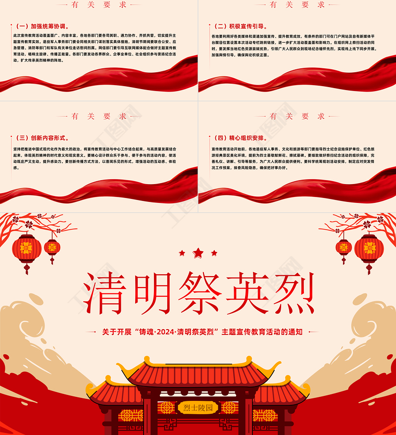 前言今年是中華人民共和國成立75周年,是實現“十四五”規劃目標任務的關鍵一年。為深入貫徹落實習近平總書記關于烈士褒揚工作重要指示精神,用好紅色資源、賡續紅色血脈,凝心聚力、培根鑄魂,廣泛營造崇尚英雄、緬懷先烈、關愛烈屬的濃厚氛圍,為全面建設社會主義現代化國家、全面推進中華民族偉大復興凝聚磅礴之力,決定自3月下旬至5月中旬,通過線上線下同步推進的方式集中開展“鑄魂·2024·清明祭英烈”主題宣傳教育活動。現通知如下: