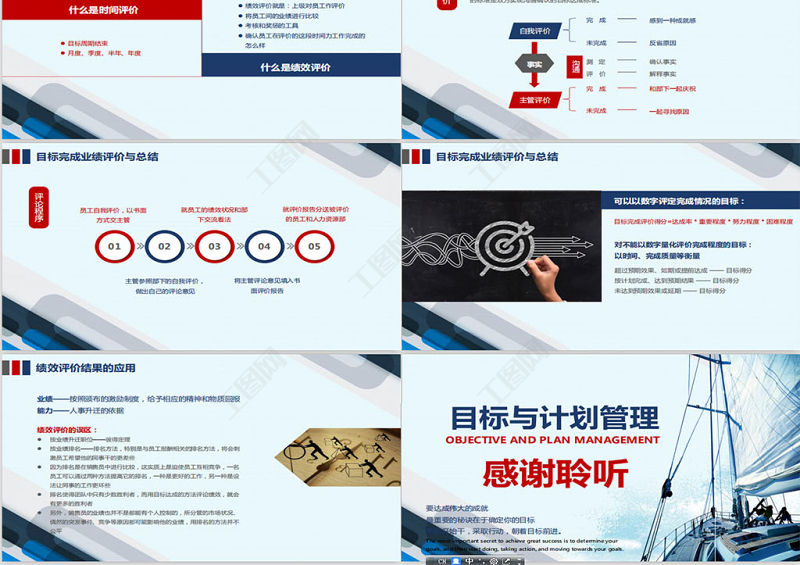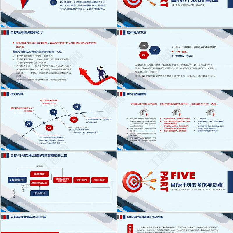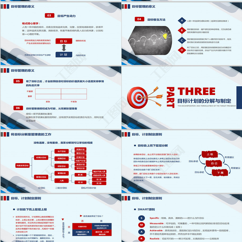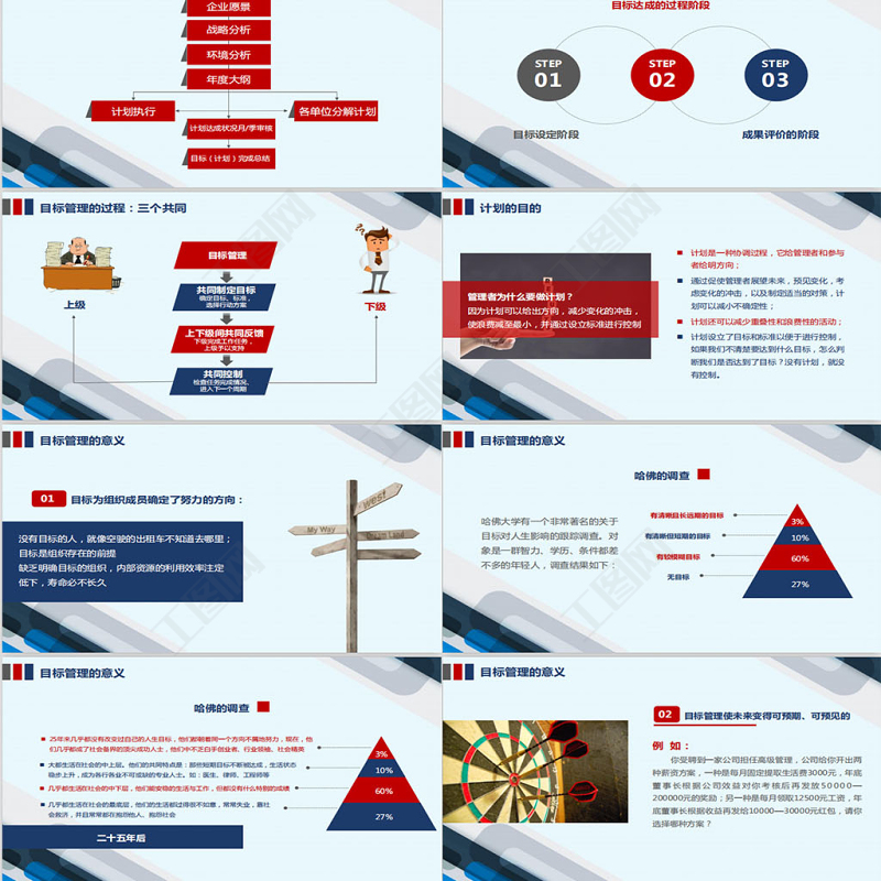 <p>目標與計劃管理要達成偉大的成就最重要的秘訣在于確定你的目標然后開始干,采取行動,朝著目標前進。The most important secret to achieve great success is to determine your goals, and then start doing, taking action, and moving towards your goals.OBJECTIVE AND PLAN MANAGEMENT 主講人:辦圖網</p><br><p>目 錄CONTENTSPARTPARTPARTPART目標計劃管理概要目標計劃的程序目標與計劃的分解與制定目標計劃的管控PART目標計劃的總結與考核</p><br><p>目標計劃管理概要SUMMARY OF TARGET PLAN MANAGEMENTPARTONE</p><br><p>什么是目標目 標是期望的成果,它是個人、部門、組織的努力方向;企業目標是在分析企業外部環境和內部條件的基礎上確定的企業各項經濟活動的發展方向和奮斗目標,是企業經營思想的具體化。</p><br><p>什么是計劃計 劃為實現目標而制訂的具體工作部署與安排:包括明確的工作任務、負責人、完成時間及所需資源等;</p><br><p>目標與計劃的關系先有目標后有計劃;目標是開展工作的根源,計劃是做好工作的保證 管理者應該通過目標對下級進行管理,當組織最高層領導者確定了組織目標后,必須對其進行有效分解,轉變成各部門及個人的分目標,管理者根據分目標完成情況對下級進行考核、評價和獎懲。</p><br><p>為什么要實行目標管理 一般的企業中存在著三種錯誤領導的因素:過分強調個人技術第一 —— 導致企業成員一盤散沙過分重視頂頭上司的個人所好 —— 導致企業成為幾個主管喜怒哀樂的應聲蟲不同層次的觀點不同 —— 導致企業成為爭吵怨氣場合為了糾正以上錯誤,就應以“目標”來貫穿各階層努力方向和獎懲中心</p><br><p>目標管理的定義和含義定 義: 使組織中的上級和下級一起參與組織目標的制定,由此決定上下級的責任和分目標,并使其在目標實施中實行自我控制,以努力完成目標的現代化管理。含 義:共同商定目標(參與)目標分解(目標體系)自我控制(授權管理和自我評價)</p><br><p>目標計劃的程序THE PROGRAM OFT HE TARGET PROGRAMPARTTWO</p><br><p>各單位分解計劃目標管理體系企業愿景戰略分析環境分析年度大綱計劃執行計劃達成狀況月/季審核目標(計劃)完成總結</p><br><p>STEP01目標管理的三大階段目標設定階段目標達成的過程階段成果評價的階段STEP02STEP03</p><br><p>目標管理的過程:三個共同目標管理共同制定目標確定目標、標準,選擇行動方案上下級間共同反饋下級完成工作任務,上級予以支持共同控制檢查任務完成情況、進入下一個周期上級下級</p><br><p>計劃的目的管理者為什么要做計劃?因為計劃可以給出方向,減少變化的沖擊,使浪費減至最小,并通過設立標準進行控制計劃是一種協調過程,它給管理者和參與者給明方向;通過促使管理者展望未來,預見變化,考慮變化的沖擊,以及制定適當的對策,計劃可以減小不確定性;計劃還可以減少重疊性和浪費性的活動;計劃設立了目標和標準以便于進行控制,如果我們不清楚要達到什么目標,怎么判斷我們是否達到了目標?沒有計劃,就沒有控制。</p><br><p>沒有目標的人,就像空駛的出租車不知道去哪里;目標是組織存在的前提缺乏明確目標的組織,內部資源的利用效率注定低下,壽命必不長久目標管理的意義目標為組織成員確定了努力的方向:01</p><br><p>目標管理的意義哈佛的調查哈佛大學有一個非常著名的關于目標對人生影響的跟蹤調查。對象是一群智力、學歷、條件都差不多的年輕人,調查結果如下:3%10%60%27%有清晰且長遠期的目標有清晰但短期的目標有較模糊目標無目標</p><br><p>3%10%60%27%目標管理的意義哈佛的調查二十五年后25年來幾乎都沒有改變過自己的人生目標,他們都朝著同一個方向不屑地努力,現在,他們幾乎都成了社會備界的頂尖成功人士,他們中不乏白手創業者、行業領袖、社會精英大都生活在社會的中上層。他們的共同特點是:那些短期目標不斷被達成,生活狀態穩步上升,成為各行各業不可或缺的專業人士。如:醫生、律師、工程師等幾乎都生活在社會的中下層,他們能安穩的生活與工作,但都沒有什么特別的成績幾乎都生活在社會的最底層,他們的生活都過得很不如意,常常失業,靠社會救濟,并且常常都在抱怨他人、抱怨社會</p><br><p>目標管理的意義目標管理使未來變得可預期、可預見的例 如: 你受聘到一家公司擔任高級管理,公司給你開出兩種薪資方案,一種是每月固定提取生活費3000元,年底董事長根據公司效益對你考核后再發放50000—200000元的獎勵;另一種是每月領取12500元工資,年底董事長根據收益再發給10000—30000元紅包,請你選擇哪種方案?02</p><br><p>目標管理的意義目標產生動力03格式塔心理學:人有一種本能的傾向,總是自覺地追求完美、完整,自覺地消除差異,獲得平衡;這種追求完美完整、消除差異、恢復平衡的傾向是人動力的來源;認知和諧—心理的平衡。目 標計 劃目標和現實之間的差距使我們產生改變現狀的欲望和動力而現狀使我們對目標產生游移理想的狀況當前的現實</p><br><p>目標管理的意義目標催生方法04A人是一種選擇性感知動物(選擇性信息收集者)B網狀激活系統:腦干部位的神經網絡,它負責把感官的刺激傳送到大腦皮層C網狀激活系統是我們每個人最好的行政秘書,他負責對我們的感官接受的信息進行過濾D有了目標之后,網狀激活系統能夠自動為你捕捉對目標有價值的信息,你會產生許多你原來意識不到的創意和