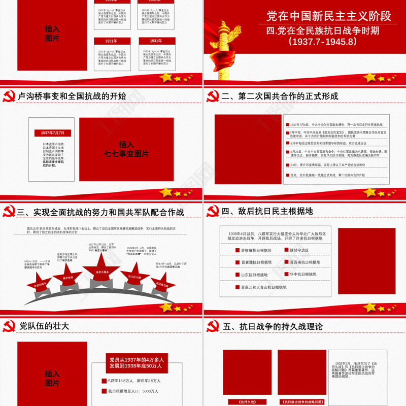 黨隊伍的壯大黨員從1937年的4萬多人發展到1938年底50萬人八路軍15.6萬人,新四軍2.5萬人抗日根據地總人口:5000萬人插入圖片