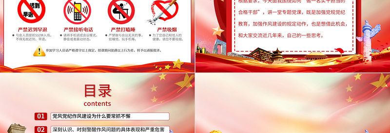 目錄contents01黨風黨紀作風建設為什么要常抓不懈02深刻認識、時刻警醒作風問題的具體表現和嚴重危害03致力“六個大”,做一名實干擔當的合格干部