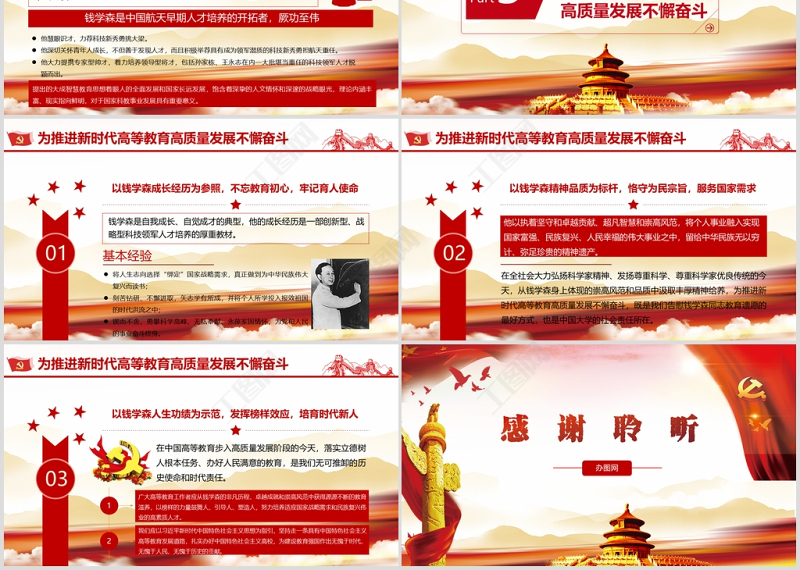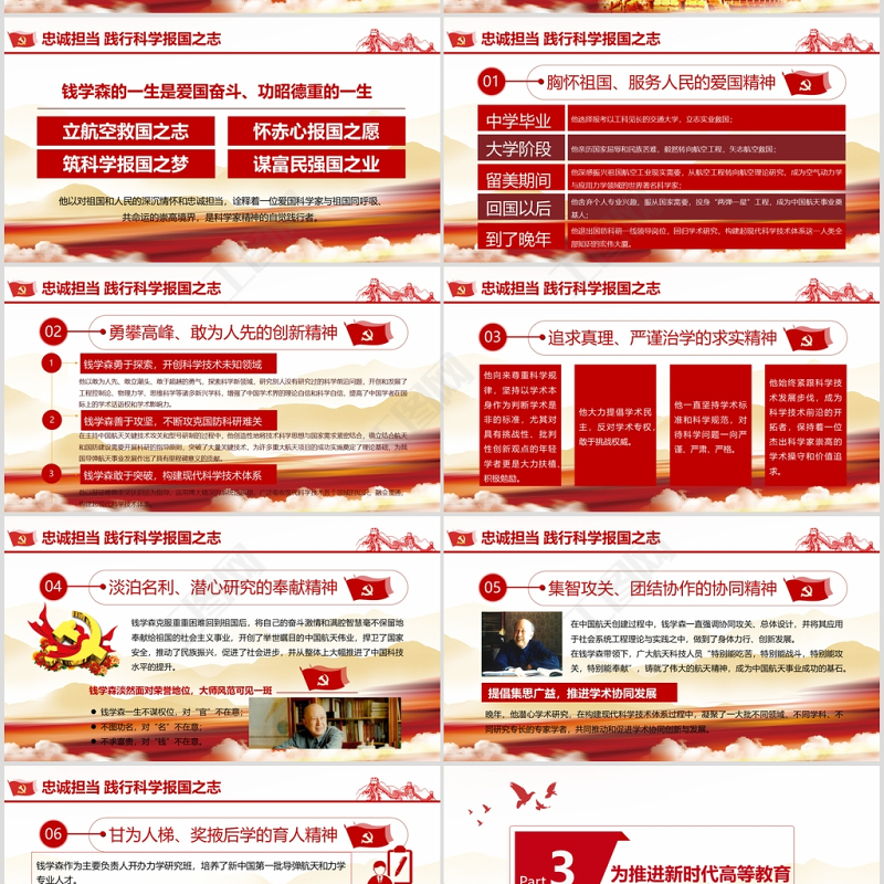<p>學習弘揚科學家精神</p><br><p>前言2019年是新中國成立七十周年,也是中國航天事業奠基人、人民科學家錢學森逝世十周年。在全社會大力弘揚科學家精神、全黨深入開展“不忘初心、牢記使命”主題教育之際,重溫錢學森光輝燦爛的科學人生,回顧他彪炳史冊的豐功偉績和超凡脫俗的人格魅力,對于新時代中國特色社會主義建設尤其是高等教育高質量發展,具有重要意義。</p><br><p>01弘揚新時代科學家精神02忠誠擔當 踐行科學報國之志03為推進新時代高等教育高質量發展不懈奮斗目錄</p><br><p>1弘揚新時代科學家精神Part</p><br><p>中國共產黨人的初心和使命為中國人民謀幸福為中華民族謀復興主題教育123是貫徹黨的十九大精神的重要舉措是中國共產黨永葆先進性和純潔性、永葆青春活力、永遠得到人民擁護和支持的必然要求是實現中華民族偉大復興中國夢的根本保障</p><br><p>《意見》明確提出,為實現“兩個一百年”奮斗目標、實現中華民族偉大復興的中國夢,應在全社會大力弘揚以“愛國、創新、求實、奉獻、協同、育人”為核心的新時代科學家精神,高度重視“人民科學家”等功勛榮譽表彰獎勵獲得者的精神宣傳。</p><br><p>秉持“初心為國、科學報國”使命擔當為中國國防科技事業創建與發展及社會主義現代化建設建立了不朽功勛。</p><br><p>他以熾熱的家國情懷和崇高的民族氣節,將個人的愛國之心、報國之志、效國之行、強國之情融入黨和國家交給他的偉大事業之中,將自己的科學報國夢融入國家富強、民族振興、人民幸福的中國夢之中,向祖國和人民遞交了一份愛國科學家的時代答卷。在中國特色社會主義進入新時代、中國高等教育步入高質量發展階段的今天,我們可以從錢學森身上汲取弘揚科學家精神的豐厚思想營養,以及牢記初心使命、永葆奮斗精神的強大力量。</p><br><p>2忠誠擔當 踐行科學報國之志Part</p><br><p>錢學森的一生是愛國奮斗、功昭德重的一生立航空救國之志懷赤心報國之愿筑科學報國之夢謀富民強國之業他以對祖國和人民的深沉情懷和忠誠擔當,詮釋著一位愛國科學家與祖國同呼吸、共命運的崇高境界,是科學家精神的自覺踐行者。</p><br><p>他選擇報考以工科見長的交通大學,立志實業救國;他親歷國家屈辱和民族苦難,毅然轉向航空工程,矢志航空救國;他深感振興祖國航空工業現實需要,從航空工程轉向航空理論研究,成為空氣動力學與應用力學領域的世界著名科學家;他舍棄個人專業興趣,服從國家需要,投身“兩彈一星”工程,成為中國航天事業奠基人;他退出國防科研一線領導崗位,回歸學術研究,構建起現代科學技術體系這一人類全部知識的宏偉大廈。</p><br><p>1錢學森勇于探索,開創科學技術未知領域他以敢為人先、敢立潮頭、敢于超越的勇氣,探索科學新領域,研究別人沒有研究過的科學前沿問題,開創和發展了工程控制論、物理力學、思維科學等諸多新興學科,增強了中國學術界的理論自信和科學自信,提高了中國學者在國際上的學術話語權和學術影響力。2錢學森善于攻堅,不斷攻克國防科研難關在主持中國航天關鍵技術攻關和型號研制的過程中,他創造性地將技術科學思想與國家需求緊密結合,確立結合航天和國防建設需要開展科研的指導原則,突破了大量關鍵技術,為許多重大航天項目的成功實施奠定了理論基礎,為我國導彈航天事業發展作出了具有里程碑意義的貢獻。3錢學森敢于突破,構建現代科學技術體系他以辯證唯物主義認識論為指導,運用博大精深的系統論思想,廣泛吸收現代科學技術各個領域的知識,融會貫通,構建起現代科學技術體系。</p><br><p>他向來尊重科學規律,堅持以學術本身作為判斷學術是非的標準,尤其對具有挑戰性、批判性創新觀點的年輕學者更是大力扶植、積極勉勵。他大力提倡學術民主,反對學術專權,敢于挑戰權威。他一直堅持學術標準和科學規范,對待科學問題一向嚴謹、嚴肅、嚴格。他始終緊跟科學技術發展步伐,成為科學技術前沿的開拓者,保持著一位杰出科學家崇高的學術操守和價值追求。</p><br><p>錢學森淡然面對榮譽地位,大師風范可見一斑錢學森克服重重困難回到祖國后,將自己的奮斗激情和滿腔智慧毫不保留地奉獻給祖國的社會主義事業,開創了舉世矚目的中國航天偉業,捍衛了國家安全,推動了民族振興,促進了社會進步,并從整體上大幅推進了中國科技水平的提升。錢學森一生不謀權位,對“官”不在意;不圖功名,對“名”不在意;不求富貴,對“錢”不在意。</p><br><p>在中國航天創建過程中,錢學森一直強調協同攻關、總體設計,并將其應用于社會系統工程理論與實踐之中,做到了身體力行、創新發展。在錢學森帶領下,廣大航天科技人員“特別能吃苦,特別能戰斗,特別能攻關,特別能奉獻”,鑄就了偉大的航天精神,成為中國航天事業成功的基石。晚年,他潛心學術研究,在構建現代科學技術體系過程中,凝聚了一大批不同領域、不同學科、不同研究專長的專家學者,共同推動和促進學術協同創新與發展。</p><br><p>他慧眼識才,力薦科技新秀勇挑大梁。他深切關懷青年人成長,不但善于發現人才,而且積極舉薦具有成為領軍潛質的科技新秀勇擔航天重任。他大力提攜專家型帥才,著力培養領導型將才,包括孫家棟、王永志在內一大批堪當重任的科技領軍人才脫穎而出。提出