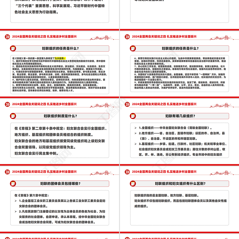 婦聯(lián)組織的性質(zhì)是什么?在《中華全國婦女聯(lián)合會章程》(以下簡稱《章程》)總則中規(guī)定:婦女聯(lián)合會是全國各族各界婦女為爭取進一步解放與發(fā)展而聯(lián)合起來的群團組織,是中國共產(chǎn)黨領(lǐng)導下的人民團體,是黨和政府聯(lián)系婦女群眾的橋梁和紐帶,是國家政權(quán)的重要社會支柱。2024全國兩會關(guān)鍵詞之四 扎實推進鄉(xiāng)村全面振興