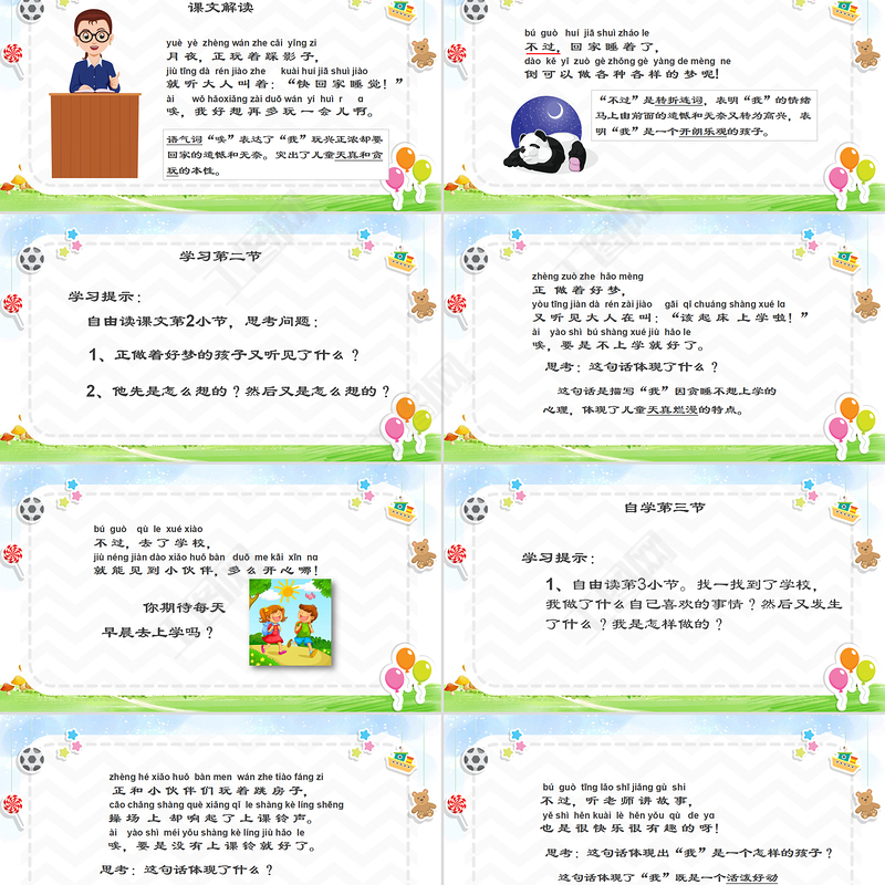 正 做 著 好 夢, 又 聽 見 大 人 在 叫:“該 起 床 上 學(xué) 啦!” 唉,要 是 不 上 學(xué) 就 好 了。zhènɡ zuò zhe hǎo mènɡ yòu tīnɡ jiàn dà rén zài jiào ɡāi qǐ chuánɡ shànɡ xué lɑ ài yào shì bú shànɡ xué jiù hǎo le思考:這句話體現(xiàn)了什么? 這句話是描寫“我”因貪睡不想上學(xué)的心理,體現(xiàn)了兒童天真爛漫的特點(diǎn)。