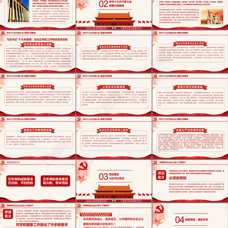 中共十九次代表大會·重要內容解讀當前,國內外形勢正在發生深刻復雜變化,我國發展仍處于重要戰略機遇期,前景十分光明,挑戰也十分嚴峻。全黨同志一定要登高望遠、居安思危,勇于變革、勇于創新,永不僵化、永不停滯,團結帶領全國各族人民決勝全面建成小康社會,奮力奪取新時代中國特色社會主義偉大勝利。五年來的成就是全方位的、開創性的,五年來的變革是深層次的、根本性的。五年來,我們黨以巨大的政治勇氣和強烈的責任擔當,提出一系列新理念新思想新戰略,出臺一系列重大方針政策,推出一系列重大舉措,推進一系列重大工作,解決了許多長期想解決而沒有解決的難題,辦成了許多過去想辦而沒有辦成的大事,推動黨和國家事業發生歷史性變革。