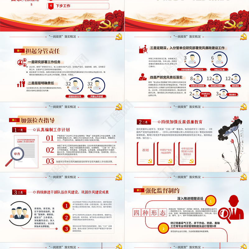 加強檢查指導第二《2020年黨風廉政建設和 反腐敗工作責任分解表》審查01嚴格落實廠2020年工作會議精神及“兩級”紀檢監察工作會議精神,認真梳理年度重點工作,編制工作計劃和運行大表,突出工作重點,明確崗位分工,嚴控時間節點,確保各項工作按計劃有序開展。02審查了采氣工藝研究所和設備管理科《2020年黨風廉政建設和反腐敗工作責任分解表》,規劃了黨風廉政責任落實、紀律教育、“三重一大”執行、三不機制建設、作風建設、日常監督、業務監督、其他監督等8個方面的重點工作,列舉45項階段性任務清單, 明確工作標準、完成時限、責任人,按時間節點檢查落實情況。03加強對分管單位黨風廉政建設的領導及黨風廉政工作安排部署。“一崗雙責”落實情況