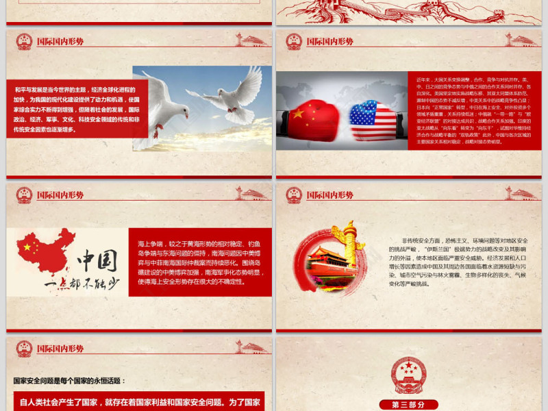 國(guó)際國(guó)內(nèi)形勢(shì) 和平與發(fā)展是當(dāng)今世界的主題,經(jīng)濟(jì)全球化進(jìn)程的加快,為我國(guó)的現(xiàn)代化建設(shè)提供了動(dòng)力和機(jī)遇,使國(guó)家綜合實(shí)力不斷得到增強(qiáng),但隨著社會(huì)的發(fā)展,國(guó)際政治、經(jīng)濟(jì)、軍事、文化、科技安全領(lǐng)域的傳統(tǒng)和非傳統(tǒng)安全因素也逐漸增多。