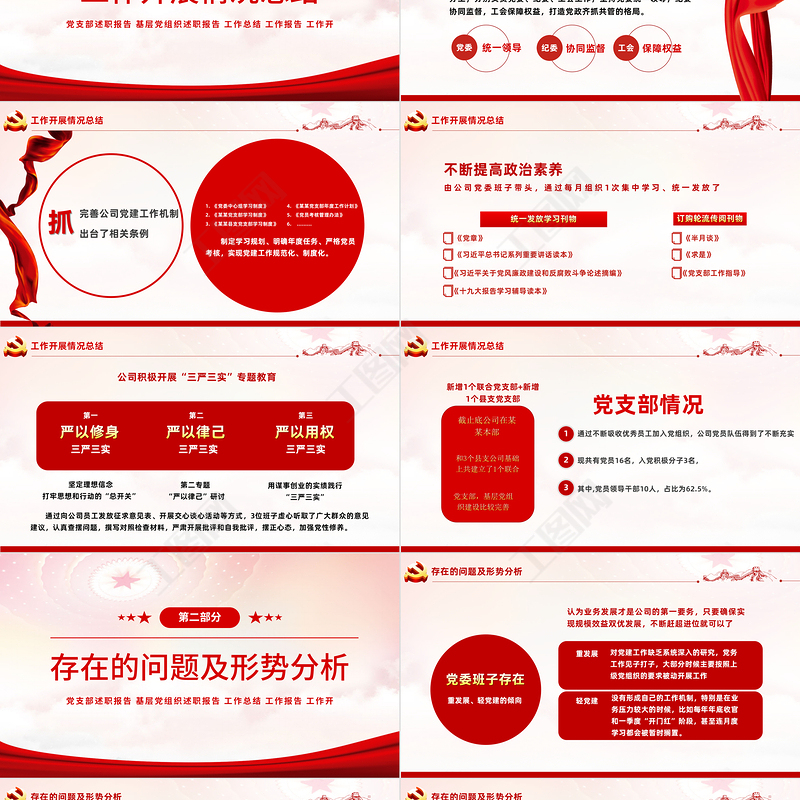 下階段工作思路和措施每年建黨節(jié)組織重溫入黨誓詞、新黨員入黨宣誓、上黨課、開(kāi)展警示教育、開(kāi)展社會(huì)公益活動(dòng)、走訪慰問(wèn)老黨員等形式多樣的黨建活動(dòng),加強(qiáng)黨、團(tuán)、工會(huì)的組織建設(shè),發(fā)揮好黨組織的核心領(lǐng)導(dǎo)作用、共青團(tuán)的后備軍作用、工會(huì)的橋梁紐帶作用。創(chuàng)新黨建工作模式在堅(jiān)持原有的學(xué)習(xí)方式的基礎(chǔ)上,增加觀看視頻、舉辦讀書(shū)會(huì),撰寫(xiě)讀書(shū)筆記、心得體會(huì),開(kāi)展特色組織生活,等拓寬學(xué)習(xí)渠道,創(chuàng)新學(xué)習(xí)方式,嚴(yán)把思想關(guān)口,認(rèn)真踐行“三嚴(yán)三實(shí)”,把專(zhuān)題教育融入經(jīng)常性學(xué)習(xí)教育之中,努力適應(yīng)新的形勢(shì),新的變化。