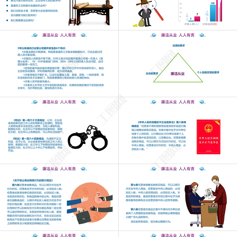 <p>企事業(yè)單位廉潔教育</p><br><p>目錄</p><br><p>廉潔從業(yè)人人有責(zé)第一章</p><br><p>廉潔只是對(duì)政府官員、企業(yè)領(lǐng)導(dǎo)人員的要求嗎?普通員工沒(méi)有面對(duì)貪腐的機(jī)會(huì)嗎?我們沒(méi)有徐才厚、蘇榮等大貪官那樣的權(quán)勢(shì),貪污腐敗與我們相關(guān)嗎?我們需要廉潔自律嗎?廉潔從業(yè) 人人有責(zé)</p><br><p>廉潔從業(yè) 人人有責(zé)通訊行業(yè)某公司腐敗情況</p><br><p>廉潔從業(yè) 人人有責(zé)5年以來(lái)通訊行業(yè)某公司案件發(fā)生的6個(gè)特點(diǎn): ◆涉案金額在不斷提高,特別是普通員工涉案金額數(shù)額較大,已遠(yuǎn)遠(yuǎn)超過(guò)經(jīng)理人員涉案金額。 ◆涉案的人員職級(jí)不斷下降。03年之前涉及的案件都是公司第一負(fù)責(zé)人(清理小金庫(kù)),04-05年就是部門領(lǐng)導(dǎo),到06-08年之間經(jīng)理人員沒(méi)問(wèn)題,出問(wèn)題的都是一線員工。 ◆發(fā)現(xiàn)的案件越來(lái)越多高智商犯罪:通過(guò)平時(shí)工作中對(duì)系統(tǒng)研究深入,能自主發(fā)現(xiàn)系統(tǒng)漏洞,并利用漏洞犯罪,成為斂財(cái)通道。 ◆涉案領(lǐng)域在不斷擴(kuò)大。以往比較重視工程、渠道、采購(gòu)、一線資源等,現(xiàn)在發(fā)現(xiàn)的在技術(shù)支撐部門,特別是掌握核心密碼和核心資源的崗位。 ◆涉案人員年齡越來(lái)越小。 ◆涉案員工在平時(shí)工作中受到的誘惑很多,在擁有權(quán)限的情況下受到的誘惑非常大,與外界的拉攏、腐蝕有很大關(guān)系。</p><br><p>廉潔從業(yè) 人人有責(zé)</p><br><p>廉潔從業(yè) 人人有責(zé)《刑法》第一百六十三條規(guī)定,公司、企業(yè)或者其他單位的工作人員利用職務(wù)上的便利,索取他人財(cái)物或者非法收受他人財(cái)物,為他人謀取利益,數(shù)額較大的,處五年以下有期徒刑或者拘役;數(shù)額巨大的,處五年以上有期徒刑,可以并處沒(méi)收財(cái)產(chǎn)。 《刑法》第一百六十四條規(guī)定,為謀取不正當(dāng)利益,給予公司、企業(yè)或者其他單位的工作人員以財(cái)物,數(shù)額較大的,處三年以下有期徒刑或者拘役;數(shù)額巨大的,處三年以上十年以下有期徒刑,并處罰金。</p><br><p>廉潔從業(yè) 人人有責(zé) 《中華人民共和國(guó)反不正當(dāng)競(jìng)爭(zhēng)法》第八條明確規(guī)定“經(jīng)營(yíng)者不得利用財(cái)物或者其他手段進(jìn)行賄賂以銷售或者購(gòu)買商品。在帳外暗中給予對(duì)方單位或者個(gè)人回扣的,以行賄論處;對(duì)方單位或者個(gè)人在帳外暗中收受回扣的,以受賄論處。經(jīng)營(yíng)者銷售或購(gòu)買商品,可以以明示方式給對(duì)方折扣,可以給中間人傭金。經(jīng)營(yíng)者給對(duì)方折扣、中間人傭金,必須如實(shí)入帳。”</p><br><p>廉潔從業(yè) 人人有責(zé)《關(guān)于禁止商業(yè)賄賂行為的暫行規(guī)定》第六條經(jīng)營(yíng)者銷售商品,可以以明示方式給予對(duì)方折扣。經(jīng)營(yíng)者給予對(duì)方折扣的,必須如實(shí)入帳;經(jīng)營(yíng)者或者其他單位接受折扣的,必須如實(shí)入帳。本規(guī)定所稱折扣,即商品購(gòu)銷中的讓利,是指經(jīng)營(yíng)者在銷售商品時(shí),以明示并如實(shí)入帳的方式給予對(duì)方的價(jià)格優(yōu)惠,包括支付價(jià)款時(shí)對(duì)價(jià)款總額按一定比例即時(shí)予以扣除和支付價(jià)款總額后再按一定比例予以退還兩種形式。本規(guī)定所稱明示和入帳,是指根據(jù)合同約定的金額和支付方式,在依法設(shè)立的反映其生產(chǎn)經(jīng)營(yíng)活動(dòng)或者行政事業(yè)經(jīng)費(fèi)收支的財(cái)務(wù)帳上按照財(cái)務(wù)會(huì)計(jì)制度規(guī)定明確如實(shí)記載。</p><br><p>廉潔從業(yè) 人人有責(zé)第七條經(jīng)營(yíng)者銷售或者購(gòu)買商品,可以以明示方式給中間人傭金。經(jīng)營(yíng)者給中間人傭金的,必須如實(shí)入帳;中間人接受傭金的,必須如實(shí)入帳。本規(guī)定所稱傭金,是指經(jīng)營(yíng)者在市場(chǎng)交易中給予為其提供服務(wù)的具有合法經(jīng)營(yíng)資格中間人的勞務(wù)報(bào)酬。第八條經(jīng)營(yíng)者在商品交易中不得向?qū)Ψ絾挝换蛘咂鋫€(gè)人附贈(zèng)現(xiàn)金或者物品。但按照商業(yè)慣例贈(zèng)送小額廣告禮品的除外。違反前款規(guī)定的,視為商業(yè)賄賂行為。</p><br><p>廉潔從業(yè) 人人有責(zé)</p><br><p>廉潔從業(yè) 人人有責(zé)</p><br><p>廉潔從業(yè) 人人有責(zé) ◆企業(yè)所有人員,從領(lǐng)導(dǎo)者到基層員工,不管是業(yè)務(wù)員、審查員或采購(gòu)員也都成天與企業(yè)客戶打交道,很可能產(chǎn)生不廉潔行為。 ◆如果我們放松警惕、降低對(duì)自己的要求,并且將占企業(yè)便宜看成理所當(dāng)然,則一旦手中有權(quán)力可以行使、有便利可以利用時(shí),腐敗就會(huì)被很快變成事實(shí)。</p><br><p>廉潔從業(yè)理智選擇第二章</p><br><p>廉潔從業(yè) 人人有責(zé)精神賬:擔(dān)驚受怕事業(yè)賬:前途盡毀自由賬:身陷牢籠家庭賬:家破難圓健康賬:身心憔悴經(jīng)濟(jì)帳:長(zhǎng)期的損失</p><br><p>廉潔從業(yè) 人人有責(zé)經(jīng)濟(jì)賬:長(zhǎng)期金錢的損失</p><br><p>廉潔從業(yè) 人人有責(zé)事業(yè)賬:前途盡毀曾因職務(w