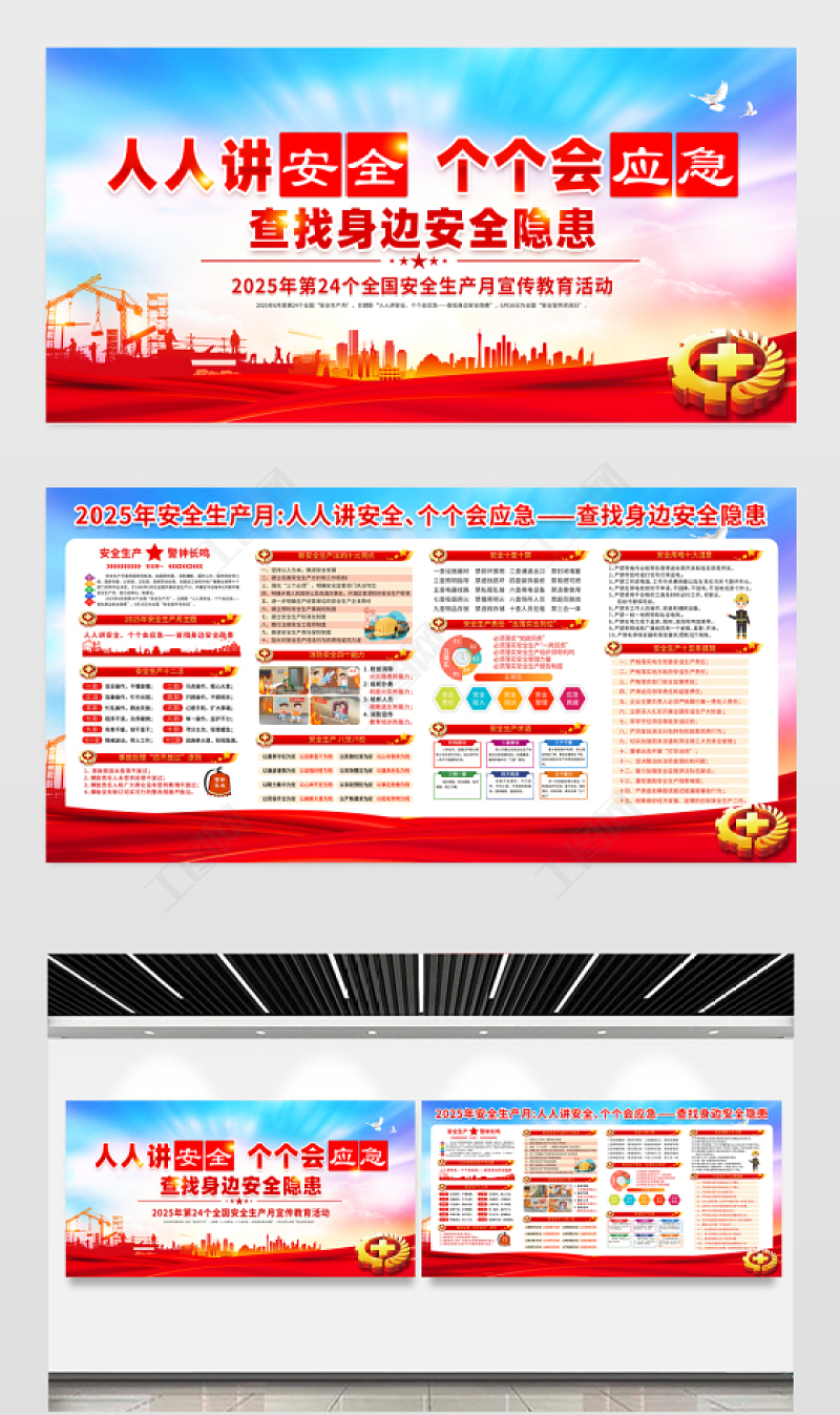 2025全國安全生產月宣傳欄紅色大氣人人講安全個個會應急查找身邊安全隱患安全知識宣傳展板 Array