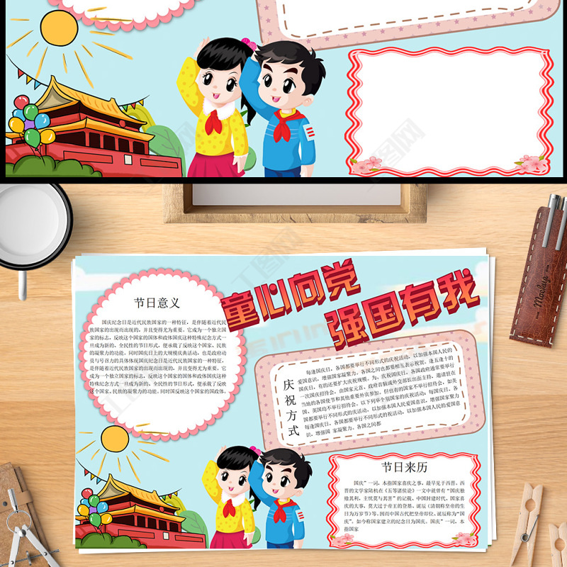 2021百年榮光童心共繪手抄報卡通紅色黨政風系列童心向黨強國有我小學生小報模板