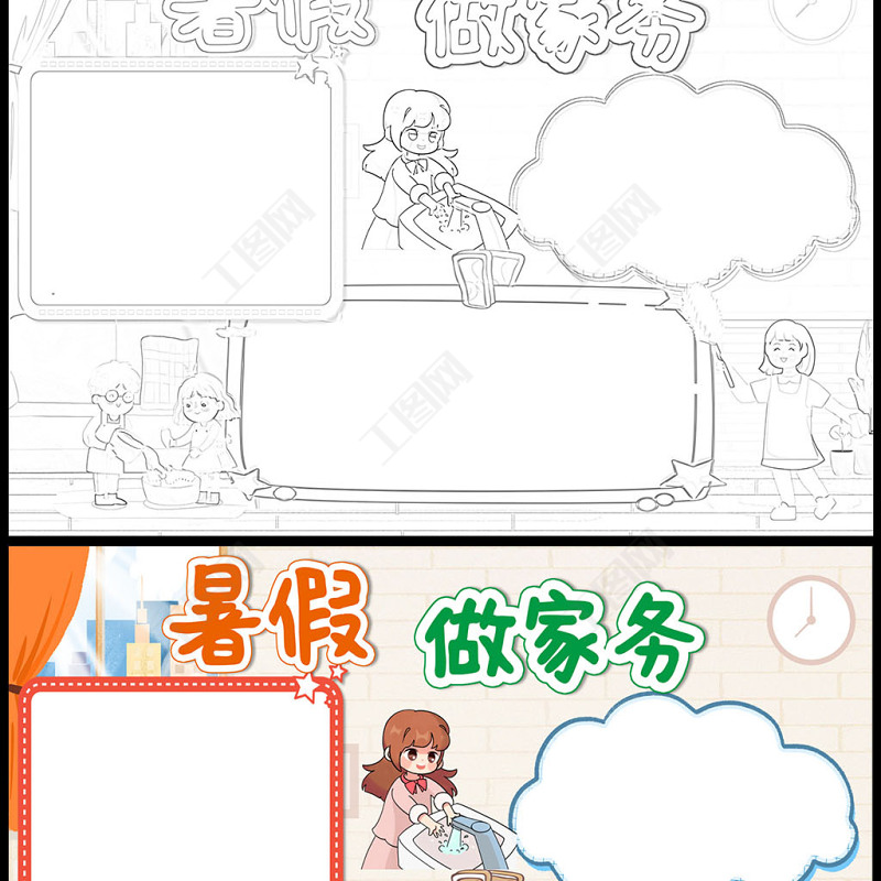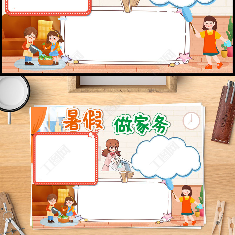 2022暑假做家務手抄報卡通風中小學生暑假勞動電子小報模板 Array