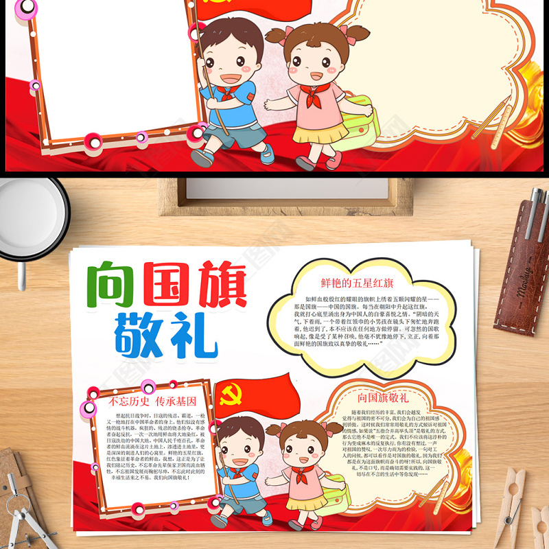 2021向國旗敬禮手抄報紅色黨政風鮮艷的五星紅旗小學生愛國教育小報模板 Array