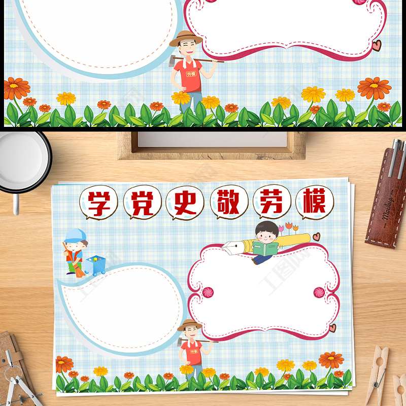 2021學黨史敬勞模手抄報清新童趣黨史進校園黨史教育專題小報模板