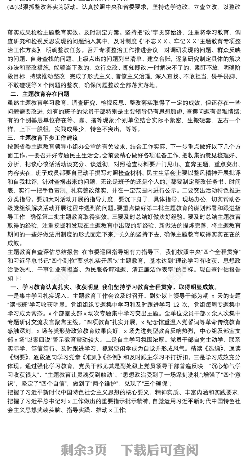 機關單位主題教育總結匯報自查評估報告三篇