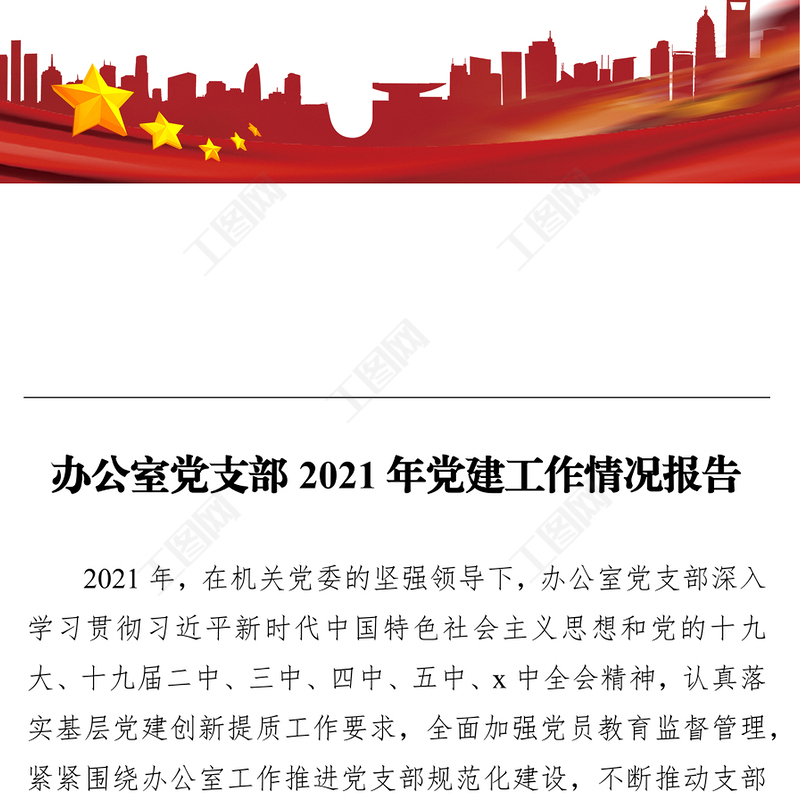 工圖網(wǎng)提供辦公室黨支部2021年黨建工作情況報(bào)告供會(huì)員免費(fèi)下載。更多精彩黨課PPT素材,盡在工圖網(wǎng)。