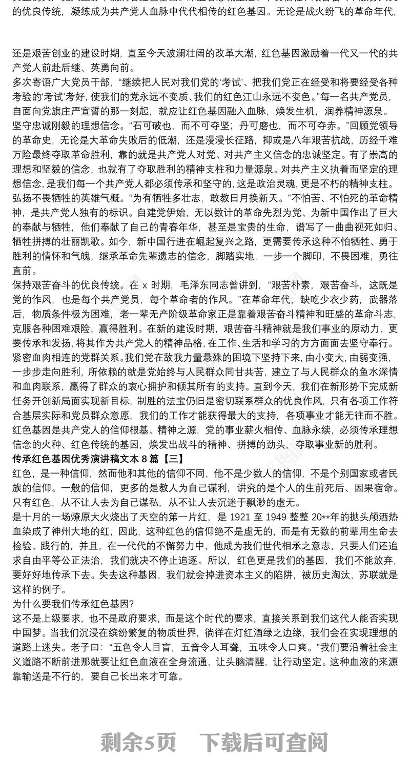 工圖網提供傳承紅色基因優秀演講稿文本8篇供會員免費下載。更多精彩黨課PPT素材,盡在工圖網。