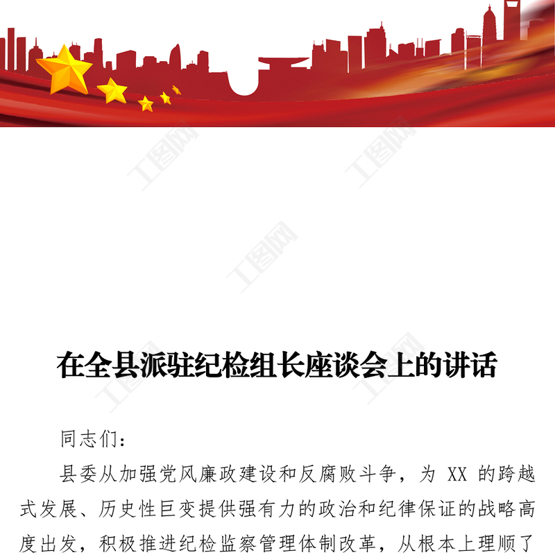 工圖網提供在全縣派駐紀檢組長座談會上的講話供會員免費下載。更多精彩黨課PPT素材,盡在工圖網。
